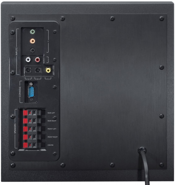 Gli ingressi sono stati posizionati nella parte posteriore del subwoofer e comprendono tre inglessi analogici uno coassiale S/PIDF, uno a fibra ottica, e due connettori RCA per ingresso audio stereo.