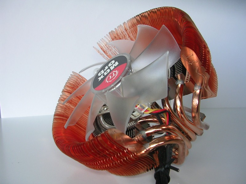 Dalla base si dipartono 6 heatpipes in rame del diametro di 6mm, che rialzano il corpo dissipante di circa 3cm rispetto alla sommità della base. Le heatipes sono poi piegate ad anello e attraversano le alette formando dei cerchi. In realtà sembrano ricongiungersi all'estremità opposta del dissipatore, in corrispondenza della staffa che sorregge il potenziometro, facendo quindi supporre che siano soltanto tre heatpipes che partono dalla base e poi ritornano. Tuttavia questo non costituirebbe una grande differenza in quanto il funzionamento sarebbe comunque simile a quello di 6 heatpipes distinte. Da notare che solo le heatpipes più esterne conducono il calore a delle alette in rame. Per quelle centrali, che trasportano anche più calore, è stato scelto infatti un corpo con alette radiali in alluminio. Benché sia risaputo che il rame conduce meglio il calore, non a tutti è noto che l'alluminio offre proprietà migliori di scambio termico (e per questo motivo è spesso preferito per la costruzione delle alette). L'argomento offre numerosi spunti di discussione ma, a nostro giudizio, la scelta di utilizzare l'alluminio nella parte sottostante alla ventola, non è stata fatta per risparmiare sul costo minore rispetto al rame (oltretutto è una parte anche molto piccola rispetto al resto del dissipatore) ma per migliorare le prestazioni. La stessa soluzione di alette sia in alluminio che in rame era stata già adottata sul DuOrb, dissipatore già recensito tempo fa dalla nostra redazione.