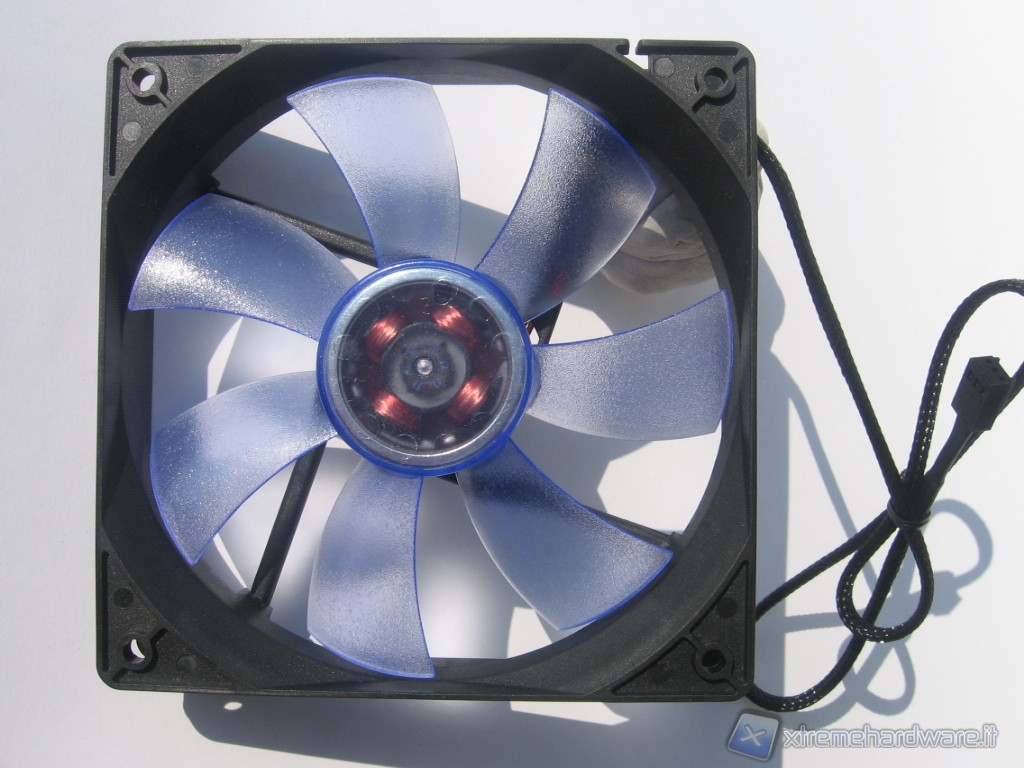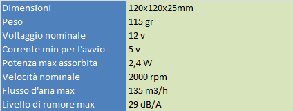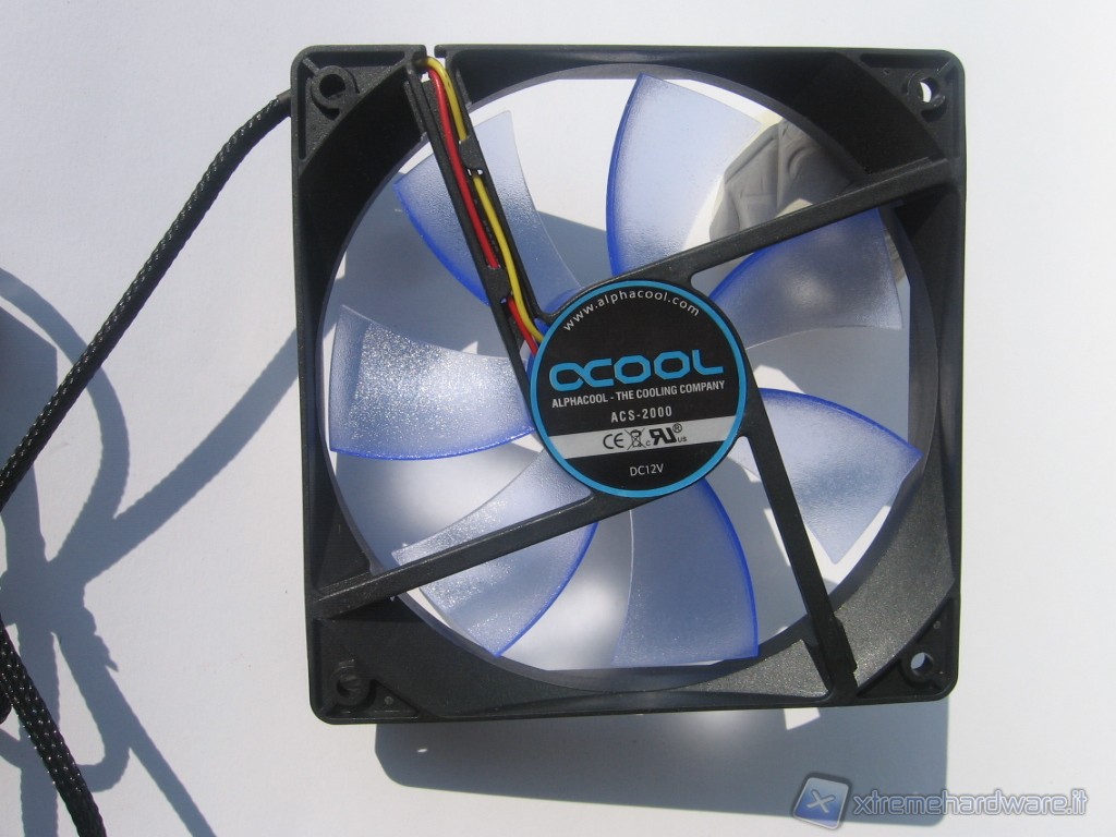 Le pale sono in materiale trasparente con superficie zigrinata di colore azzurro. Il telaio invece ha il classico colore nero. L’attacco della ventola è di tipo ormai standard, a 3 pin, con il terzo pin che invia il segnale sulla velocità di rotazione alla scheda madre oppure al rheobus, per cui la velocità può essere variata a piacimento a seconda delle esigenze. Consigliamo caldamente l’adozione di un rheobus oppure di un software per il monitoraggio perché, essendo ventole ad alta velocità, potrebbe non essere necessario farle girare al massimo, a tutto guadagno della silenziosità e del confort. Prenderemo in esame questo aspetto effettuando un confronto delle ventole oggetto di questa recensione con altre ventole a parità di rotazione. Mostriamo adesso nella tabella seguente una sintesi delle caratteristiche tecniche del prodotto Alphacool :