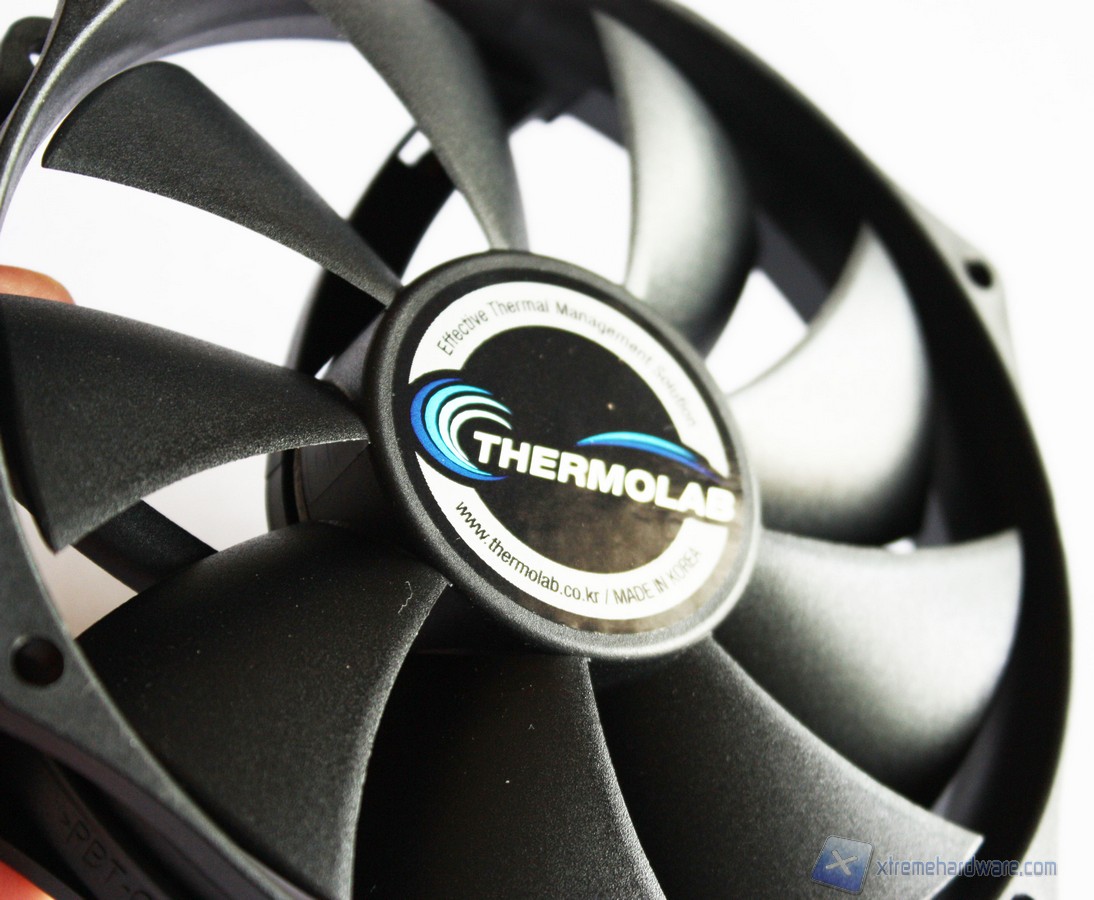 Detto questo passiamo all’analisi del modello ADDA AR1212LX-A9BGL. La ventola in dotazione al Trinity è come detto da 130 mm ed appartiene alla tipologia PWM. La colorazione è la classica nera per l’intero corpo. Il connettore PWM a 4 pin permetterà di variare la velocità di rotazione, in maniera automatica, in base al carico della CPU. Il cavo del connettore PWM non è rivestito in treccia di tessuto ma per la tipologia e la destinazione di utilizzo non è strettamente necessario. Il disegno non è classico ma ha una forma circolare. Questo potrebbe portarvi a pensare che non sia possibile cambiarla, invece il modello in oggetto misura 130 mm solo per quanto riguarda il diametro ma i fori riprendono quelli di una classica 120 mm, quindi nel caso si volesse sostituire la ventola in dotazione con una a vostro piacimento ciò sarà possibile senza problemi. Le pale di tale ventola hanno un profilo classico. La ventola è ancorata saldamente al dissipatore tramite quattro supporti in gomma antivibrazione che quindi hanno la doppia funzione di non intaccare la struttura lamellare con eventuali viti e di ridurre al minimo le vibrazioni generate al massimo dei giri.Facciamo notare che Thermolab non ha previsto la possibilità di installare una seconda ventola in pull, oppure di rialzare la ventola anteriore ma avremo modo comunque di sostituire quella pre-installata con una classica 120 millemetri. Tali modifiche non saranno pertanto facili da effettuare, ma saranno tutto sommato inutili dato che il Trinity è stato studiato per funzionare al meglio in questa modalità.