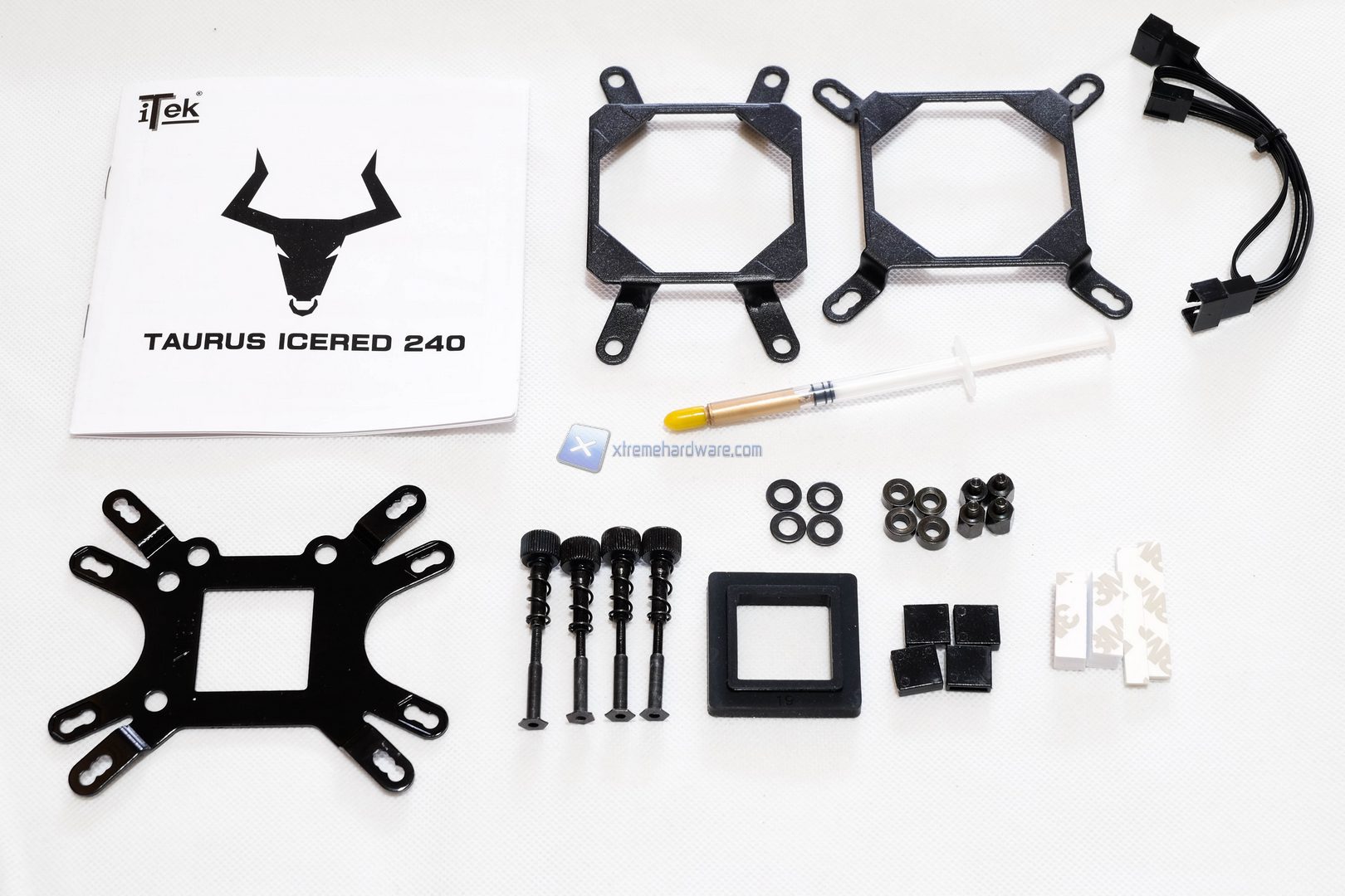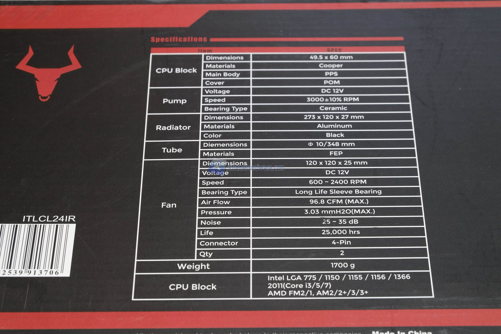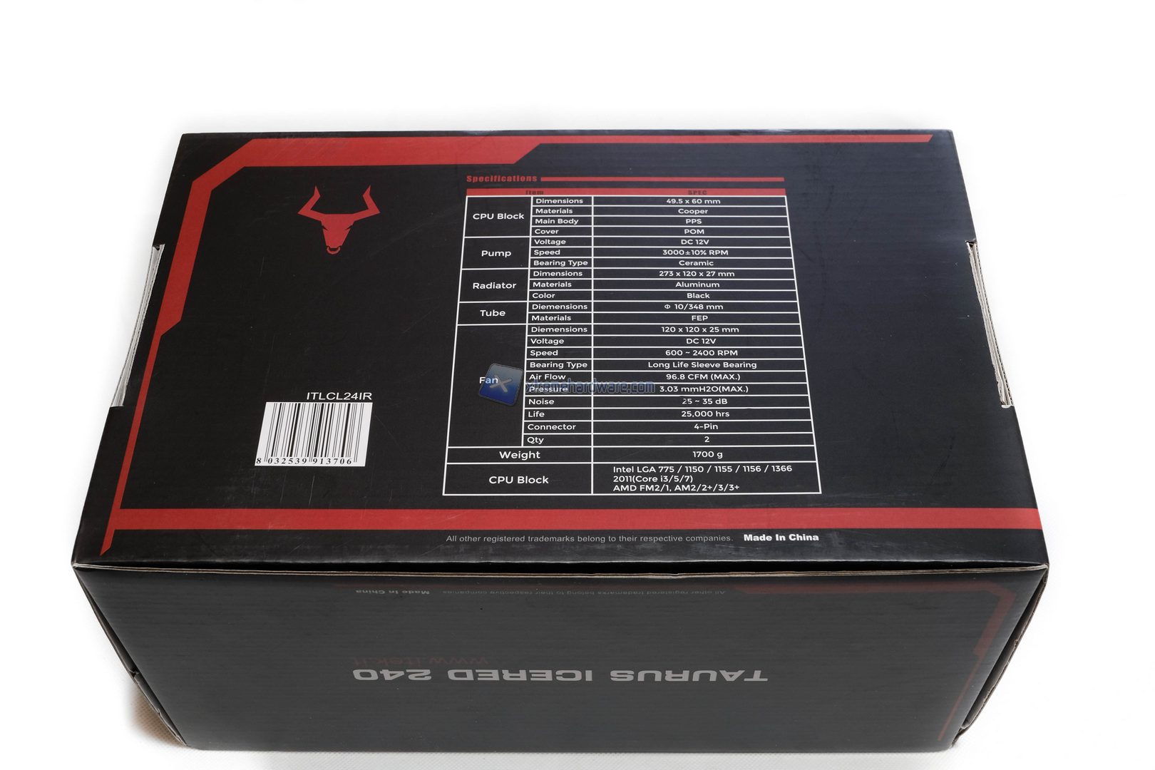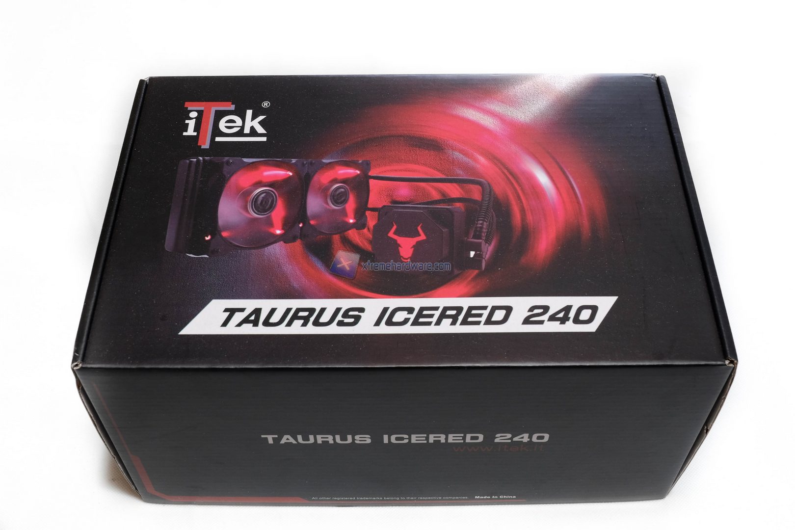 Il dissipatore Itek Taurus Icered 240 è riposto all’interno di una scatola di notevoli dimensioni, caratterizzata da una doppia colorazione nera-rossa. La confezione garantisce un’ottima protezione durante il trasporto, inoltre fornisce utilissime informazioni sulle caratteristiche del prodotto.