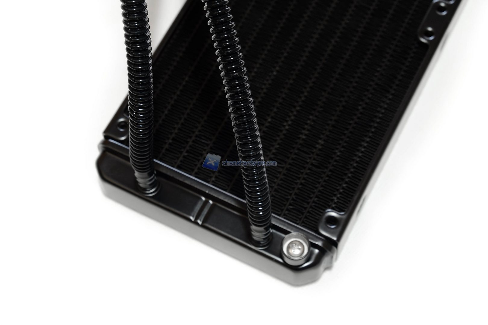 Nella parte inferiore del radiatore troviamo installati i due tubi in FEP e una vite per svuotare il loop in caso ce ne fosse necessità. I lati sono completamente planari e non presentano alcuna peculiarità. I tubi come abbiamo detto sono realizzati in FEP con diametro di 10 mm, meno belli rispetto a quelli in gomma ma sicuramente molto meno rigidi e di conseguenza più facili da adattare all’interno del nostro case. Infine la loro lunghezza è di circa 35 cm, davvero lunghi.