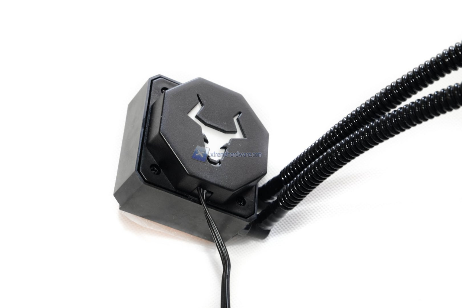 Ora passiamo all’analisi dell’elemento che sarà a contatto con la nostra CPU, ossia il corpo waterblock / pompa. Itek ha fatto un deciso passo in avanti in termini di design con il nuovo Icered 240, infatti passiamo da una forma quadrata ad una ottagonale realizzata in resina acetilica ad elevata resistenza meccanica. Posizionato al centro del WB troviamo un toro stilizzato che si illuminerà di rosso grazie ad un led installato all’interno del corpo in plastica. Lo spessore non è molto contenuto, assestandosi sui 40 mm.