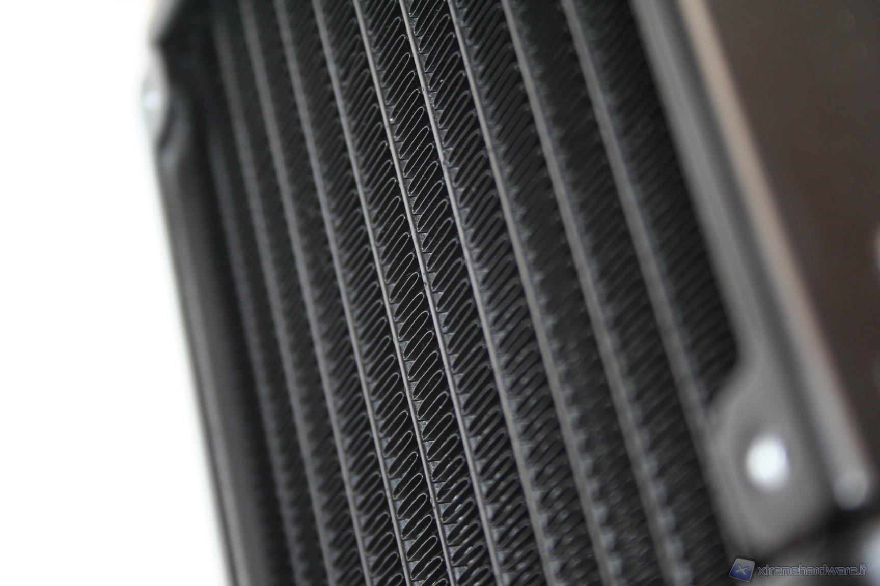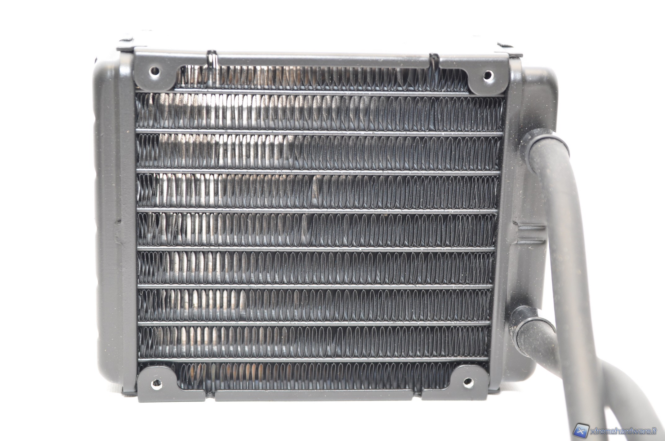 Partendo da questi presupposti analizziamo la struttura stessa del radiatore. Ottimo l’assemblaggio, molto solido e non eccessivamente pesante, presenta 4 fori su ciascun lato lato per l’installazione di due ventole da 120mm. Le lamelle non sono eccessivamente spaziate, ciò implica una maggiore superficie dissipante ma allo stesso tempo ostacola il passaggio dell’aria, rendendo teoricamente necessari alti regimi di rotazione per le ventole. In fase di test abbiamo tuttavia rilevato un’ottima efficienza anche a bassi regimi di rotazione.