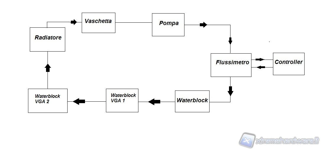 La Alphacool VPP655 corredata di HF Top Plexi D5 si è posizionata nella fascia media, battendo la Phobya DC400 ma non la Swiftech MCP355, avvantaggiata dal TOP Reservoir della XSPC. Abbiamo quindi aggiunto al circuito altri 2 waterblock per sovraccaricare ulteriormente il lavoro delle pompe e vedere come scalano in prestazioni. Lo schema è il seguente:
