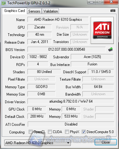 Once turned on, the Acer notebook takes about 30 seconds to get into Windows 7, a very good access time given the technical characteristics. First of all, we ascertain the hardware specifications through the CPU-Z and GPU-Z softwares.