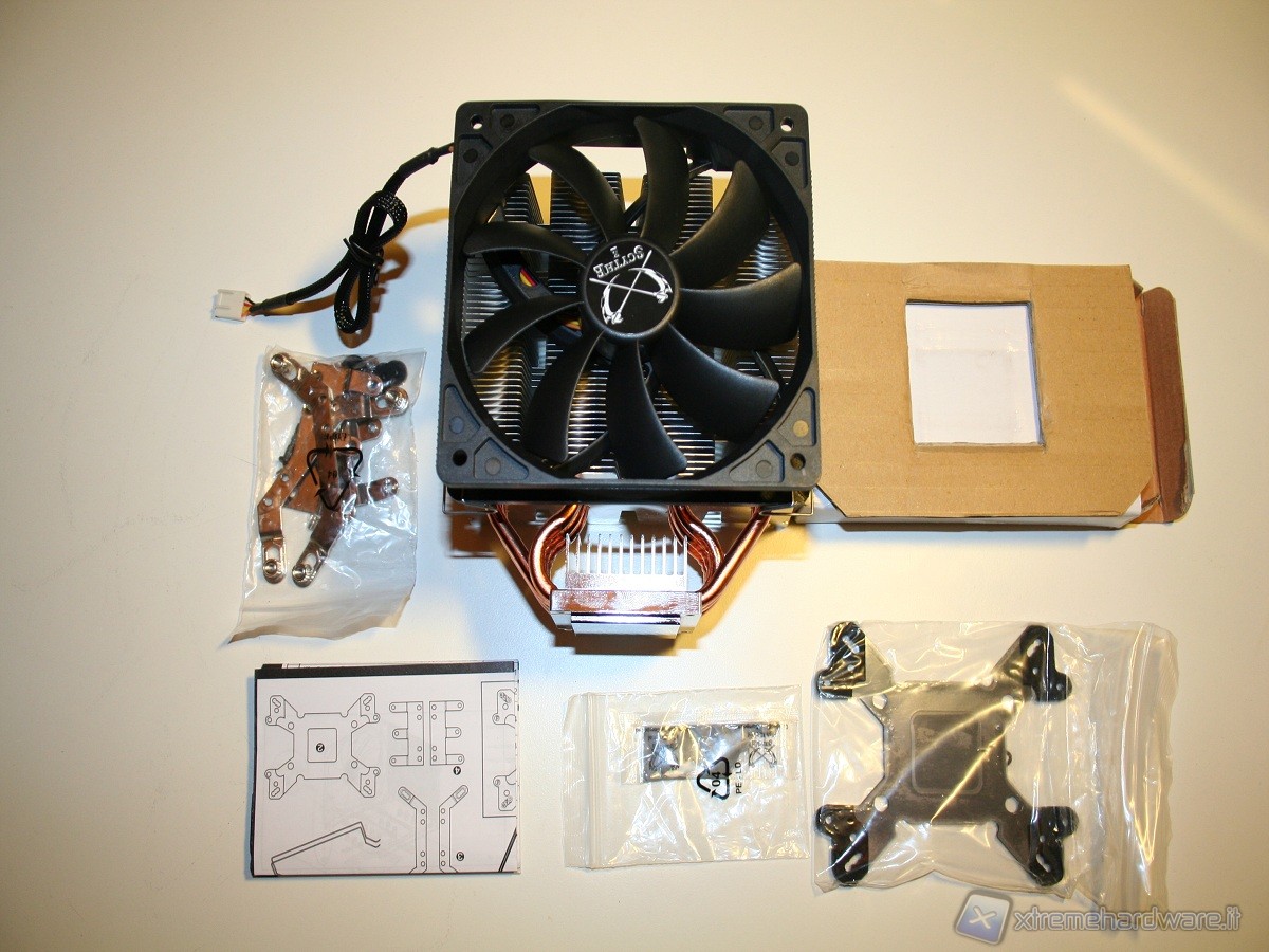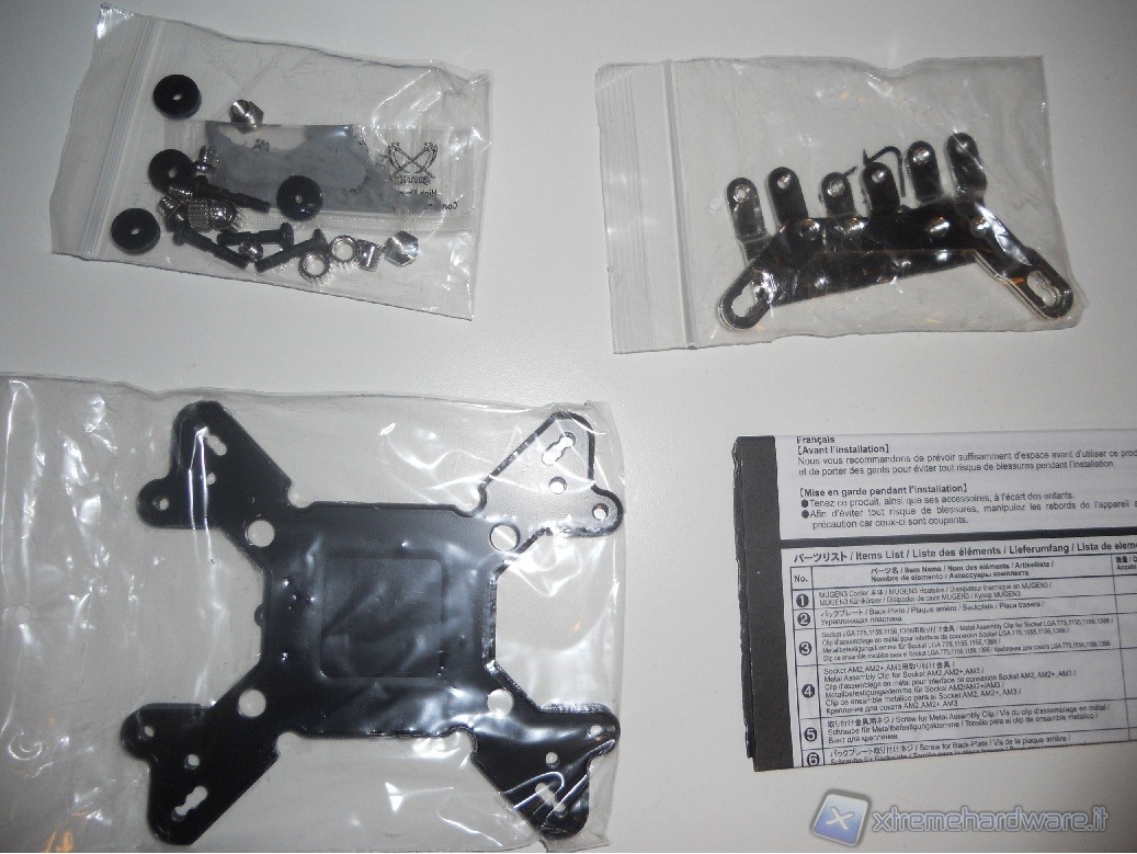The box containing the internal fan brackets and the bundle is very basic, but here again we see the meticulousness of the Japanese company, there's even a little slot where you can insert your index finger to push the content out of the small package. The bundle includes the manual, fan brackets, screws, the allen key necessary for the backplate, the backplate itself and finally brackets for various Intel and AMD sockets. Note that there is not present the classic syringe of thermal compound, but there is only a small pouch containing our beloved solution, in this case with silver percentages. Here is the complete list of what you'll find inside the box: