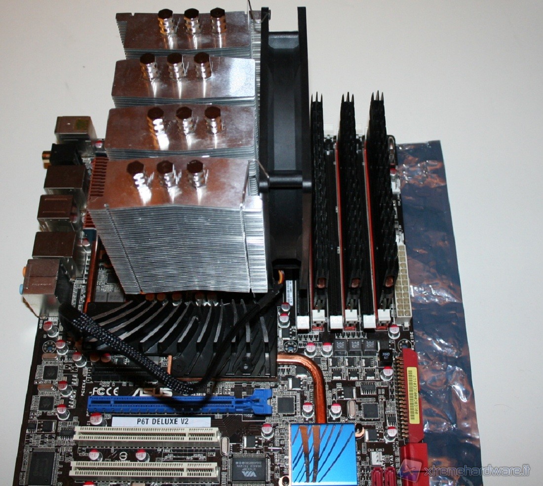 As Scythe usually grants, installation is easy and everything is very stable, once the operation is complete. The only negative note, although the overall compact size, is that if you mount the 120mm fan in push, which comes as factory default, you will occupy the first slot of RAM. However, there is the possibility to mount the fan in a pull configuration (extraction) in the back of the heat sink.In doing so, anyway, you can have a slightly worse performance but of course makes it possible to populate all six slots of RAM available in a LGA 1366 configuration. We note also that the installation was done on an ASUS P67 Deluxe V2: in other motherboards, such as the Gigabyte X58-UD5 , where the distance between slots and the socket is shorter, the fan could interfere also with the second slot instead of just the first.