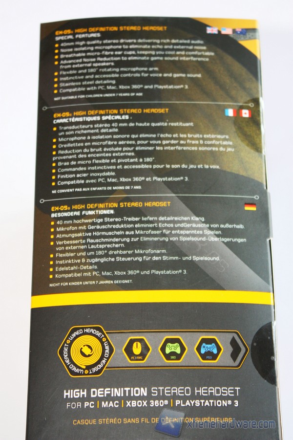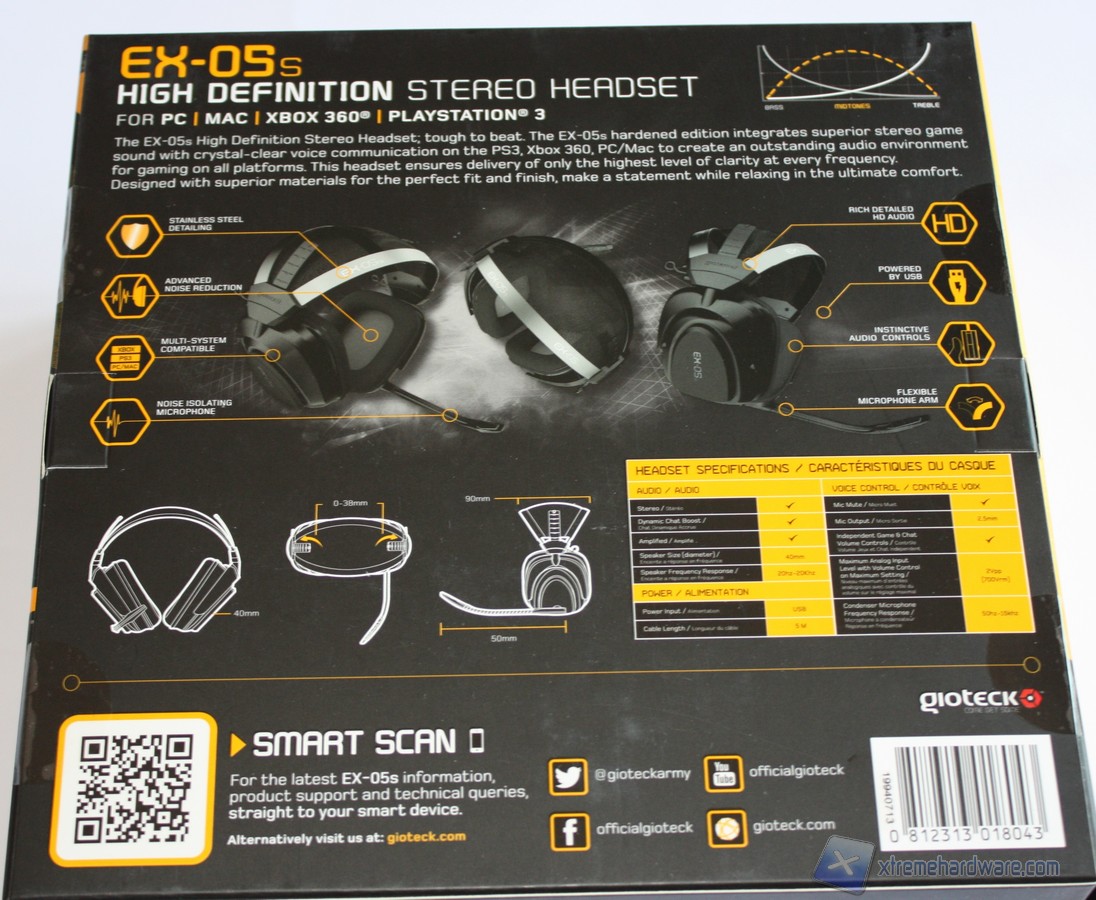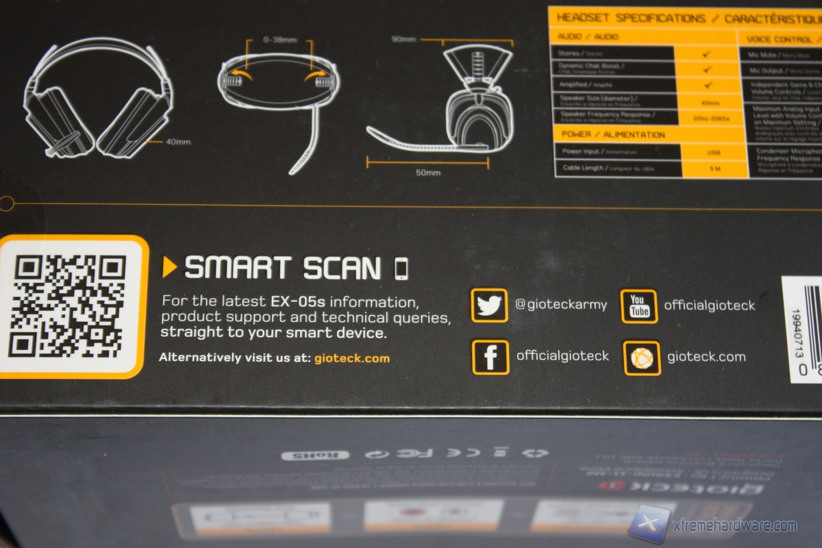 La confezione delle Gioteck EX-05s è una scatola di cartone di ridotte dimensioni sulla quale sono riportate tutte le informazioni necessarie circa l’headset. Nella parte frontale della confezione troviamo varie informazioni tra cui un immagine illustrativa dell’headset, il logo del brand, la compatibilità ed alcune specifiche tecniche delle cuffie.