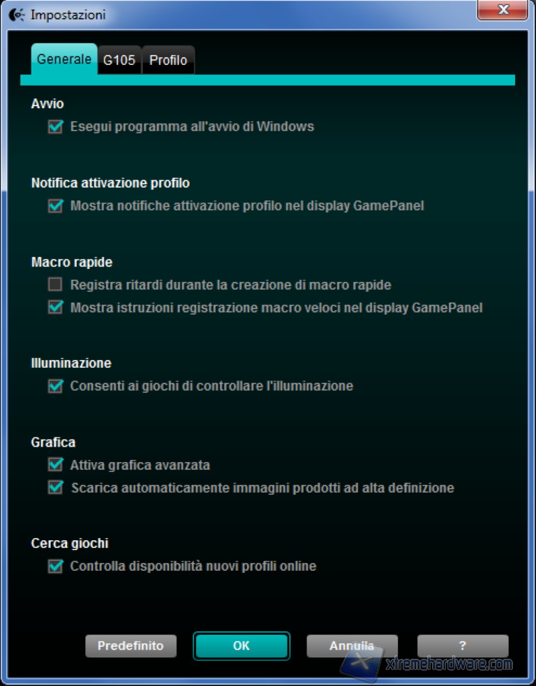 Si aprono dopo il click tre sottomenu, il primo riguarda tutte le impostazioni generali, ad esempio possiamo scegliere se fare eseguire o no al software la scansione dei giochi che all’inizio abbiamo accennato. Il secondo menu ci mostra solamente il firmware installato, che nel nostro caso è lo 0x7310. L’ultimo menu invece riguarda l’impostazione dettagliata dei vari profili, possiamo scegliere il profilo permanete e quello predefinitivo.