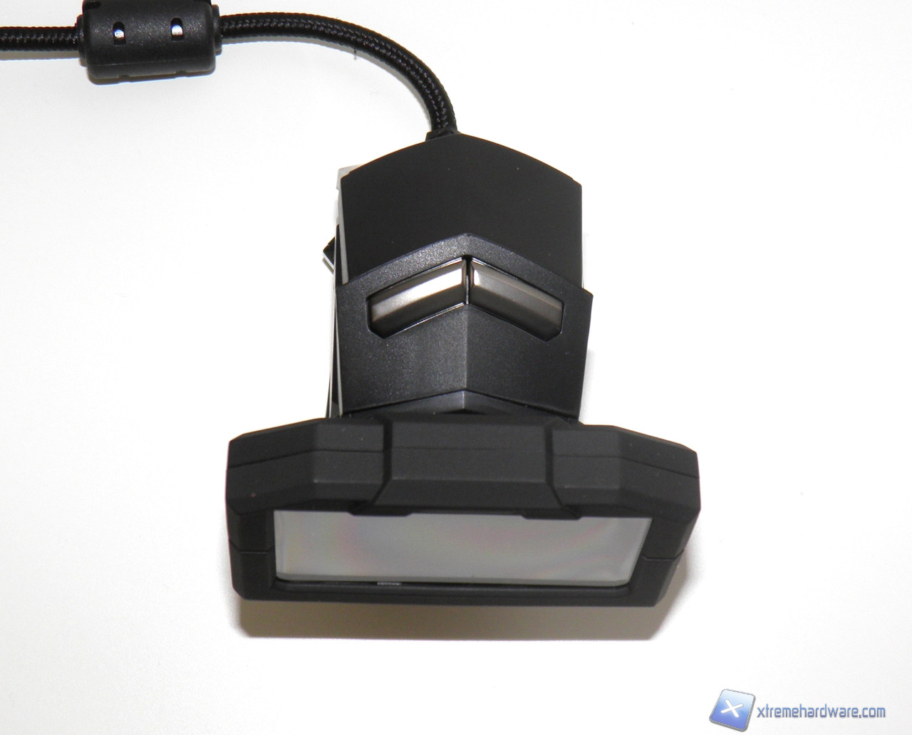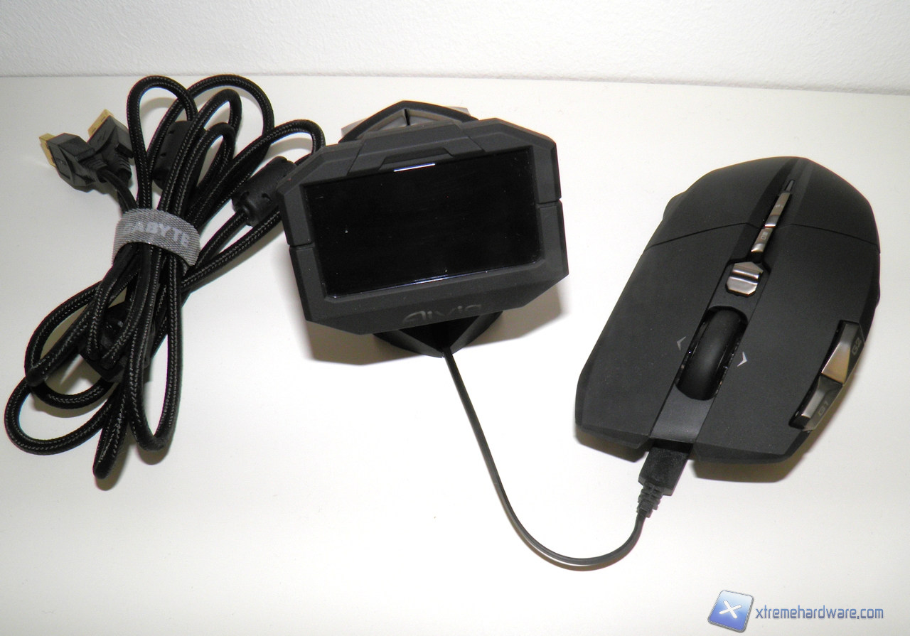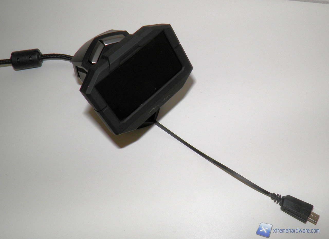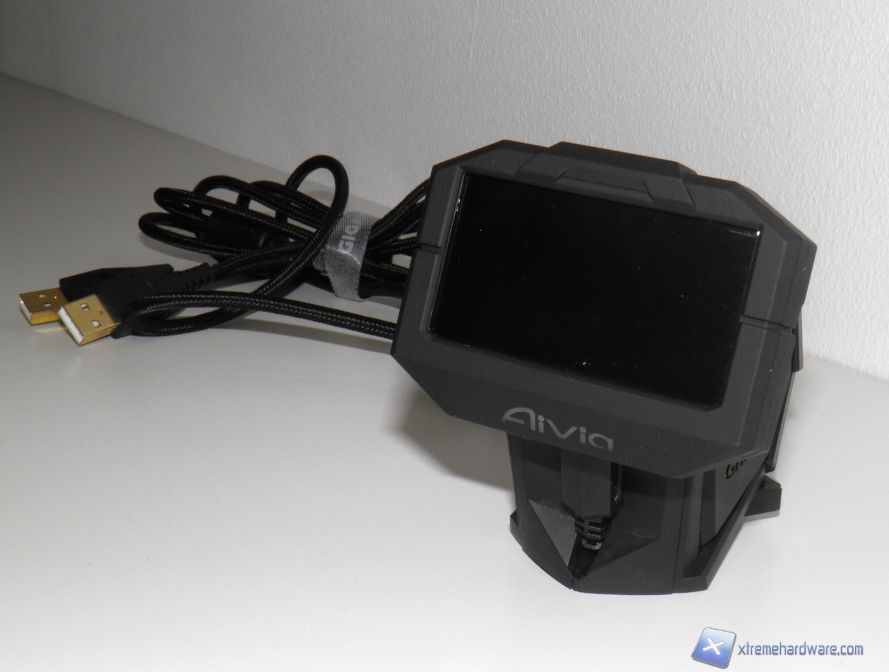 Per quanto riguarda il display, esso è regolabile a livello di inclinazione mentre i due pulsanti posti nella zona superiore della dock ne controllano la luminosità. La leggibilità è ottima, il logo Aivia cambia di colore in base al profilo selezionato mentre sotto al display è presente il cavo micro-USB estensibile per la ricarica del mouse.