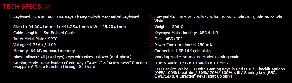 Dalle specifiche notiamo subito come il modello Strike Pro sia dotato di una memoria On-board da 64KB per poter salvare le Macro nei 6 ‘’Profili/Tasti’’ dedicati oltre a permetterci di assegnare diverse funzioni nei principali tasti. La Ozone Strike Pro offre inoltre tasti multimediali, tasto G-Mode aka Gaming Mode, tasti per la regolazione dell’intensità della retroilluminazione, della regolazione del valore del Polling Rate e molti altri che vedremo a breve. Le maggiori funzioni quali regolazione del valore di Polling Rate, intensità retroilluminazione e Macro potranno essere gestite anche dal software di gestione dedicato. La tastiera è dotata anche di una retroilluminazione bizona che permetterà di avere separati i tasti di maggior utilizzo in giochi quali FPS da quelli di utilizzo comune. Non manca l’adozione di switch meccanici CHERRY MX nei classici ‘’colori’’ quali Black, Red, Blue e Brown. Ciò come sempre permetterà all’utente finale di scegliere il modello con switch che più soddisferanno le personali esigenze.
