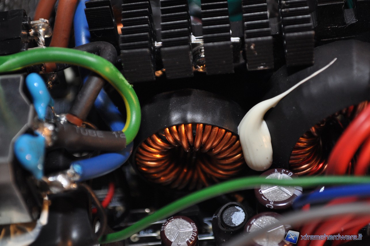 In questa immagine è possibile vedere due bobine (chiamate anche induttanze) in cui transita al loro interno una corrente raddrizzata ma pulsante. Queste bobine sono avvolte su un nucleo toroidale e coperte in cima da una guaina nera termorestringente. Quelle in foto sono bobine di modeste dimensioni, adatte per alimentatori di erogazione abbastanza alta, circa 700/800W. E’ interessante far notare come in questo alimentatore quasi tutte le bobine siano protette, ciò significa un’ottima qualità costruttiva sotto questo aspetto.