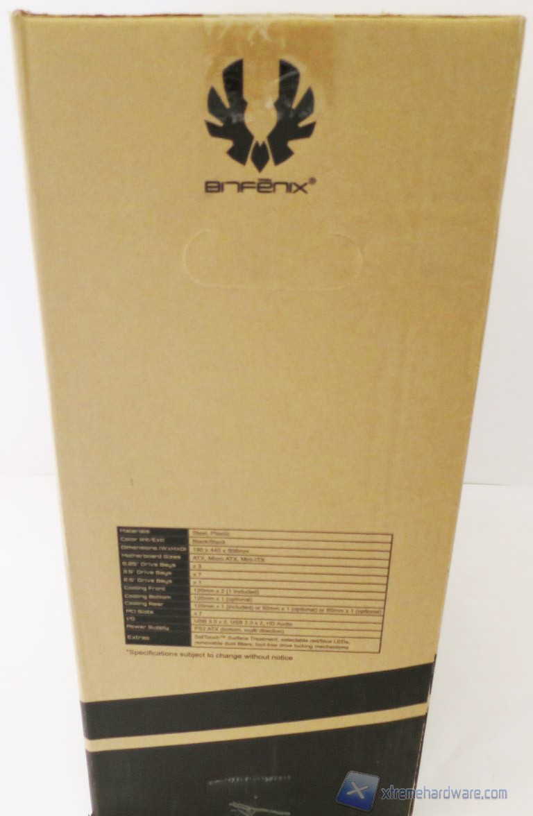 La confezione del BitFenix Shadow è come sempre realizzata in cartone. Nella parte frontale ed in quella posteriore vengono riportate alcune informazioni come il modello del case, un’immagine illustrativa dello stesso, alcune caratteristiche salienti del prodotto ed i riferimenti all’azienda.