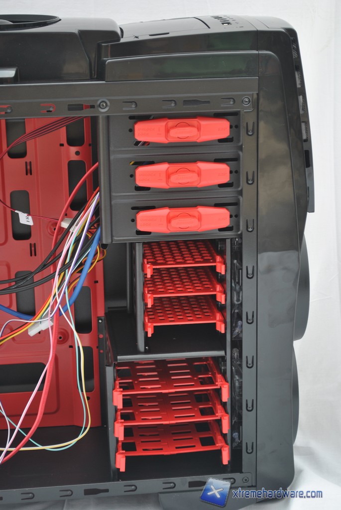 Si nota subito che anche all'interno il design è coerente con quanto mostrato esteriormente, i colori dominanti sono il rosso ed il nero. A livello costruttivo questo case si sviluppa sulla falsariga di tutta la concorrenza, essendo un prodotto di media gamma cerca di offrire soluzioni evolute con un occhio al budget, di conseguenza abbiamo una discreta organizzazione degli spazi che non contempla però un margine di manovra così ampio nei confronti dei componenti.