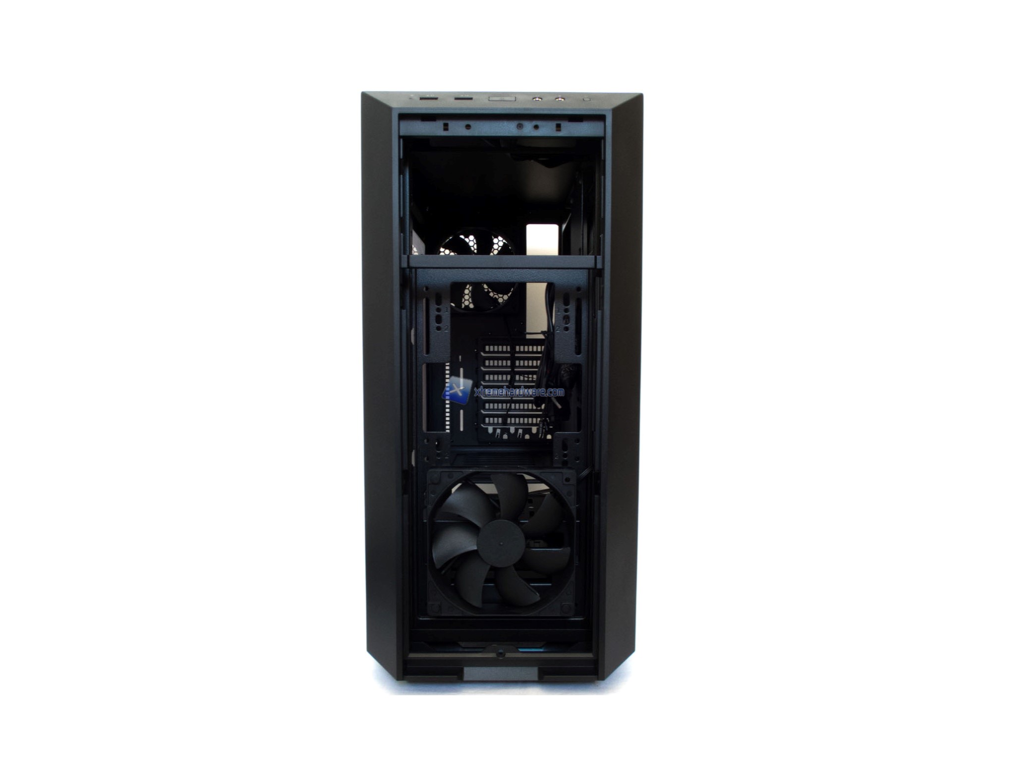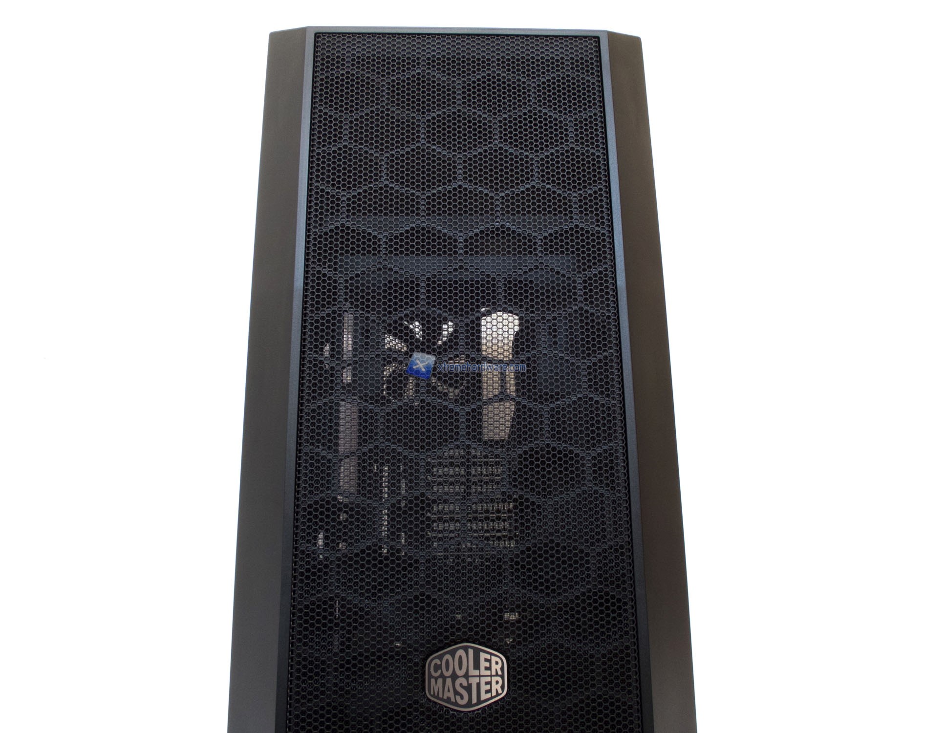 Tornando velocemente alla griglia, inutile dire che questa sarà removibile completamente per accedere alla zona interna del frontale dove potremo notare la prima ventola da 120 mm preinstallata oltre alla possibilità di installarne altre due (di cui quella nel Top tramite un supporto venduto come accessorio e non presente come nel MasterCase 5). Vedremo più avanti anche come tale supporto si potrà tramutare a livello di Liquid Cooling nell’installazione di un radiatore da 360 mm.