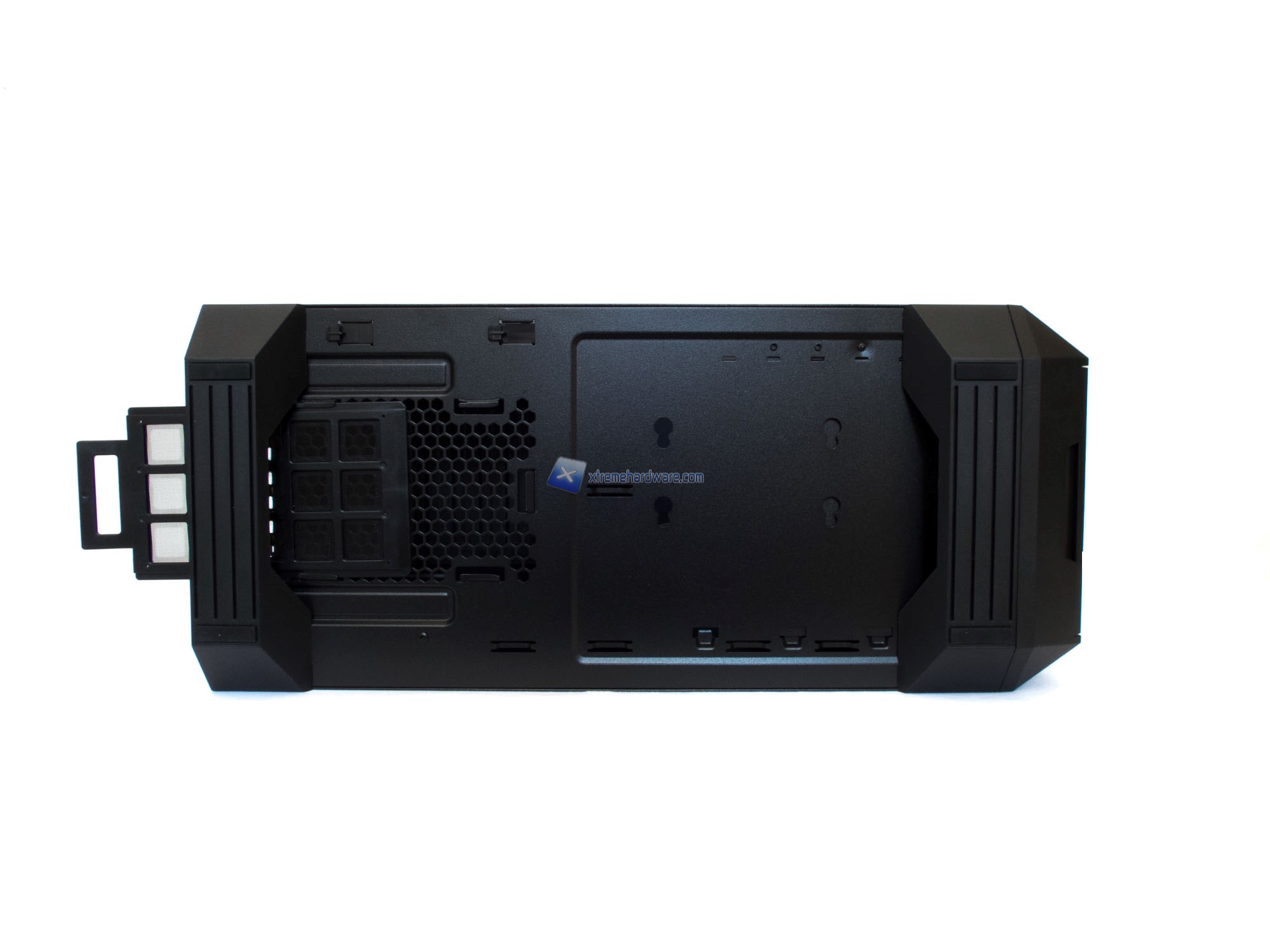 Parlando di alimentatore ci spostiamo dunque nella zona inferiore del case. Qui avremo un ulteriore ‘’dejavù’’ con i modelli MasterCase 5. Il MasterBox 5 infatti adotta come piedini due supporti in plastica di forma squadrata (con un rivestimento di gomma) a seguire il design e linee del case stesso. Nel lato di sinistra troviamo un filtro antipolvere removibile mentre nel lato centrale osserviamo, già ora, i fori per il posizionamento secondario del cage degli Hard Disk all’interno del case.