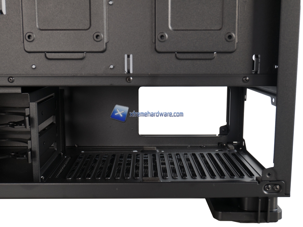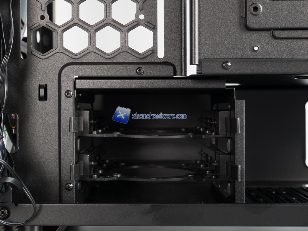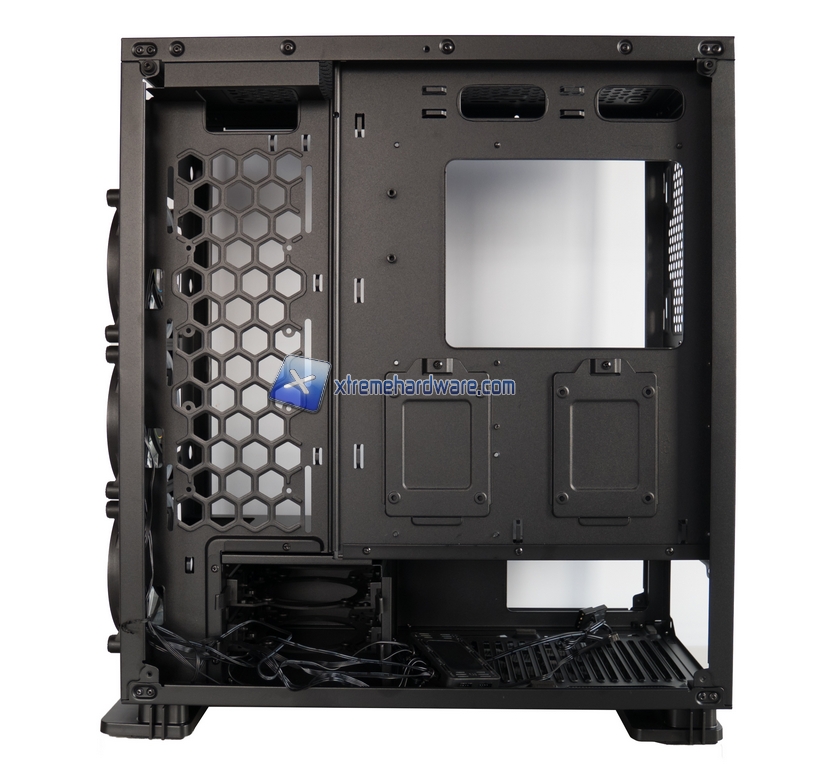 Spostandoci sul frontale abbiamo un mucchio di spazio per eventuali HDD da 2.5” (ma io ci ho fatto stare anche un HDD extra da 3.5” con un po’ di inventiva) o per posizionare con tutta comodità l’hub delle ventole, ventole che possono essere 3 in misura 120mm. Sempre sul frontale tra l’altro il midplate è stato tagliato in modo da lasciare molto spazio per un bel radiatore fino a 360mm. L’unica mancanza è quella dello slot per drive da 5.25”.