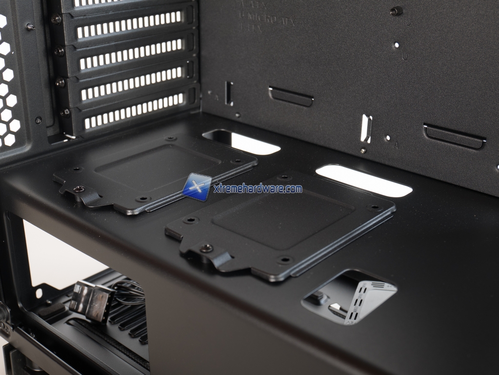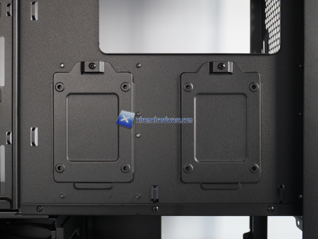 Andando più nei dettagli con la nostra analisi vediamo che il case è diviso in 3 aree: scheda madre, zona inferiore e zona frontale. La parte della scheda madre è classica, nessuna caratteristica particolare a parte i soliti fori per il cable management. La zona inferiore è molto interessante perché completamente coperta da un bel midplate nero, al di sotto troviamo l’alimentatore e la gabbia per 2 HDD da 3.5” installabili su slitte in plastica senza viti; l’alloggiamento per l’alimentatore è ovviamente dotato di foro di ventilazione con filtro antipolvere rimovibile. Aspetto interessantissimo legato al midplate è la presenza, sopra di esso, di 2 slot per storage in formato 2.5” davvero comodissimi e ben accessibili grazie ai fori per il cable management.