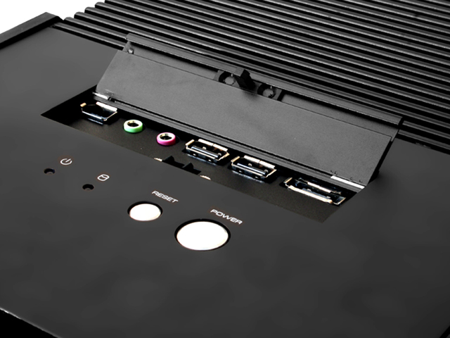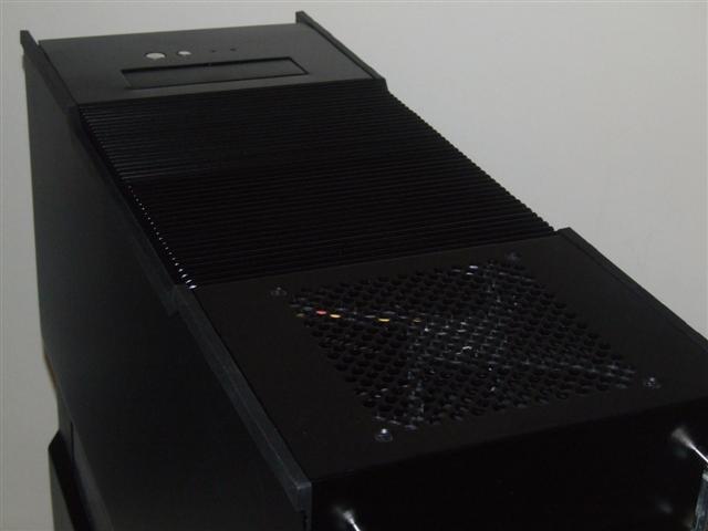 Partiamo dal tetto del case, qui troviamo in ordine i tasto PowerON, Reset e i led di stato integrati perfettamente con lo stile del case, quindi lo sportellino che nasconde una porta firewire, i jack di ingresso microfono e uscita cuffie, le prese USB ed una e-sata. Questo sportellino è in alluminio da 3mm come tutto il resto del case ed ha un sistema di chiusura ad aggancio, si apre tramite una piccola pressione del dito su di esso. Continunando sul tetto del Khaos ci imbattiamo in una superficie alettata studiata per triplicare lo scambio termico a disposizione. Grazie a questo piccolo accorgimento il cabinet riesce a dissipare una grande quantità di calore (cosa che possiamo verificare anche solo toccandolo dopo aver lasciato il PC acceso per qualche ora). Prima della fine della parte superiore troviamo una ventola da 120mm di diametro.
