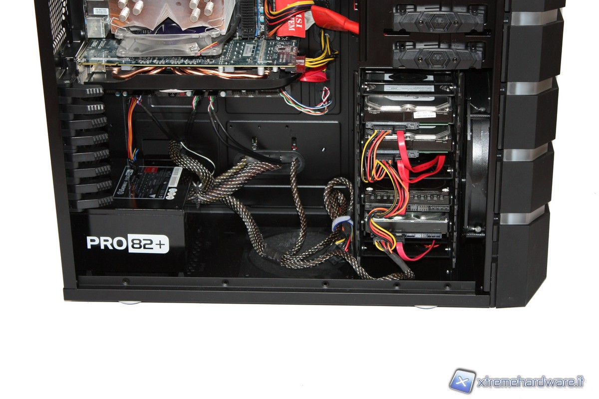 Come potete vedere dalle seguenti immagini abbiamo ottenuto una disposizione ottimale dei cavi di alimentazione anche installando 4 HD e una 5870, lo spazio che ci “avanza” internamente per poter lavorare è davvero tanto.