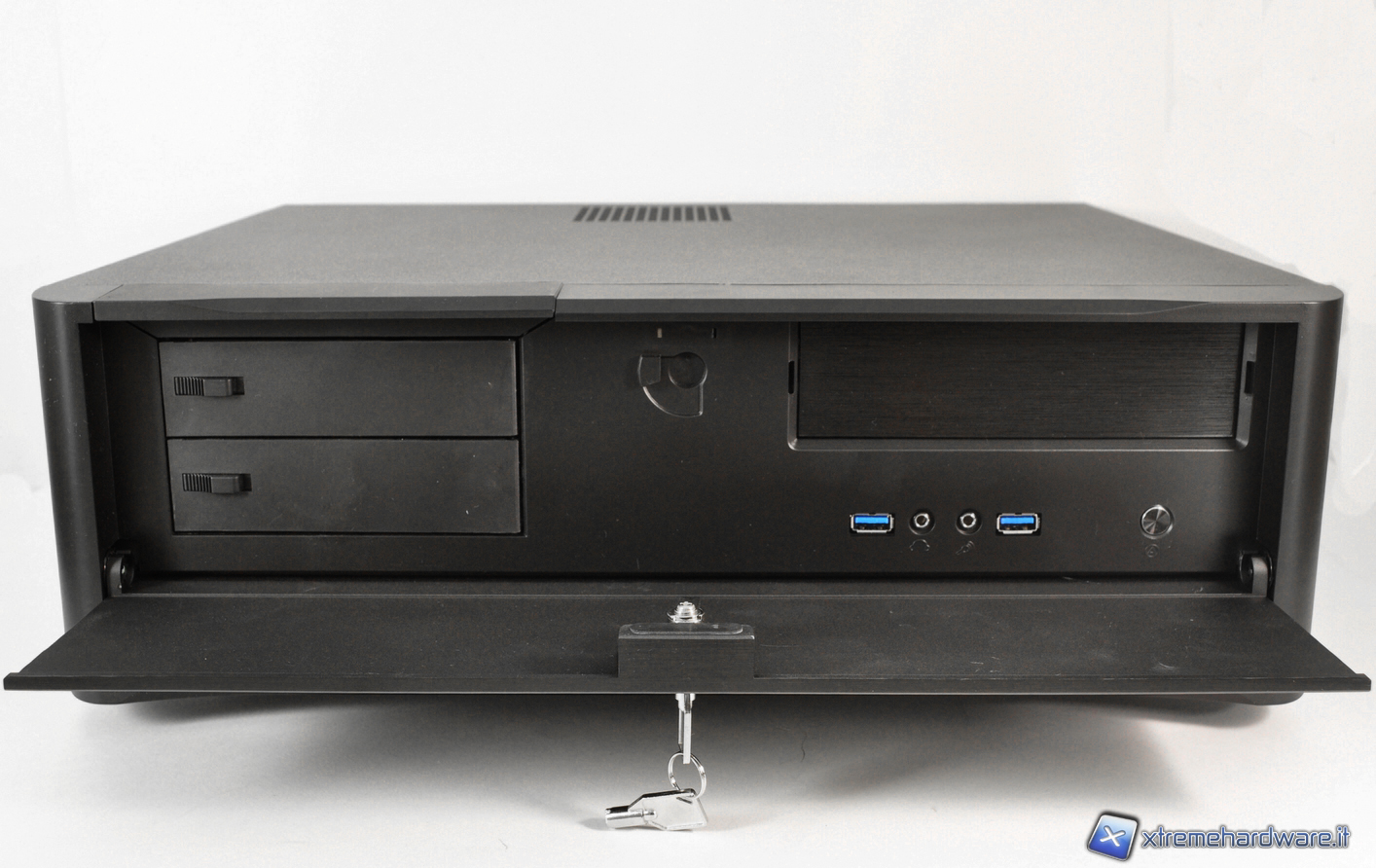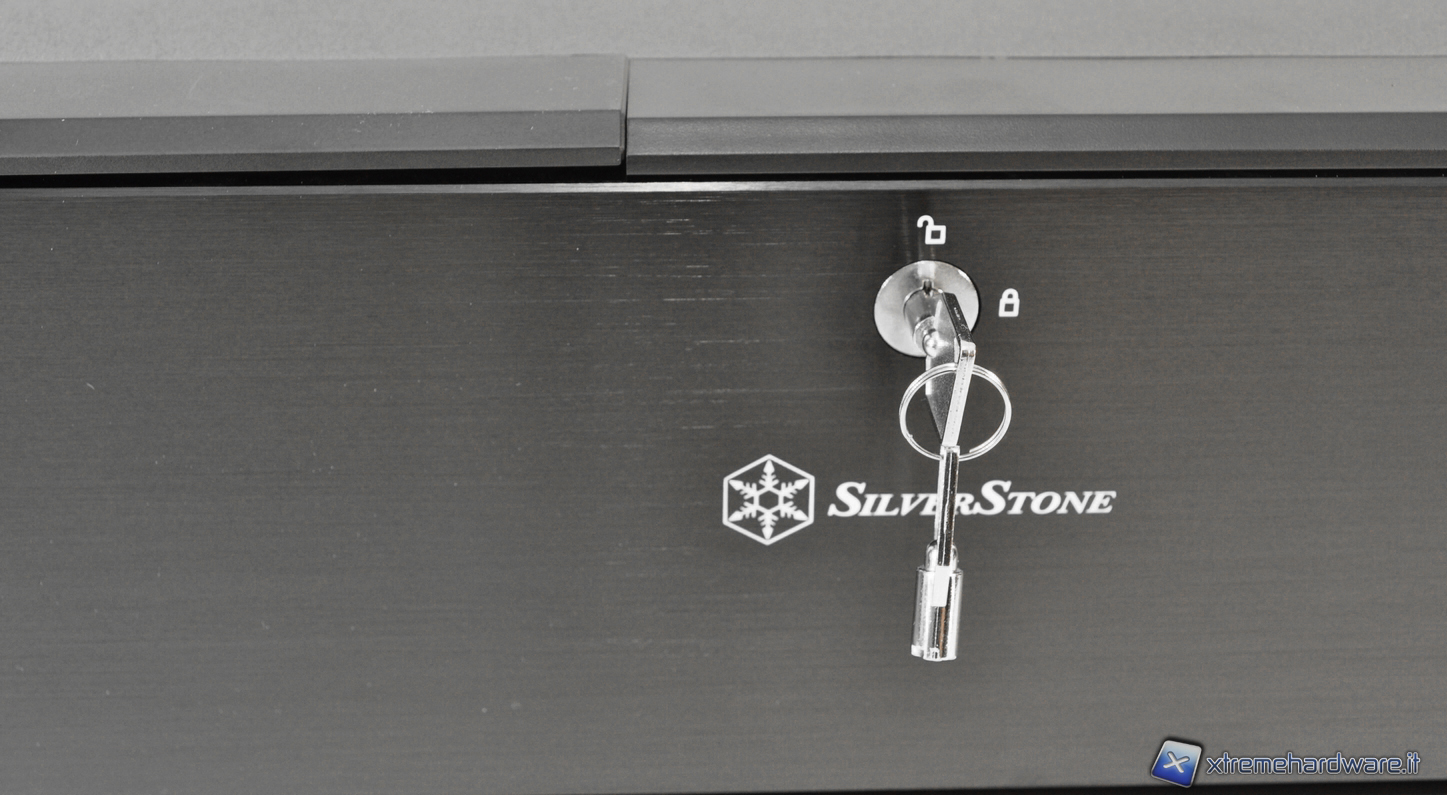 Centralmente troviamo il logo dell’azienda di color bianco e poco sopra una serratura che ci consentirà di bloccare o sbloccare lo sportello tramite le chiavi incluse nel bundle. Questo sistema di sicurezza serve a proteggere dai malintenzionati i nostri dischi hot-swap, i drive ottici, le porte usb sul frontale e il pulsante di reset nel caso in cui il PC sia situato in un posto pubblico o comunque poco sicuro.