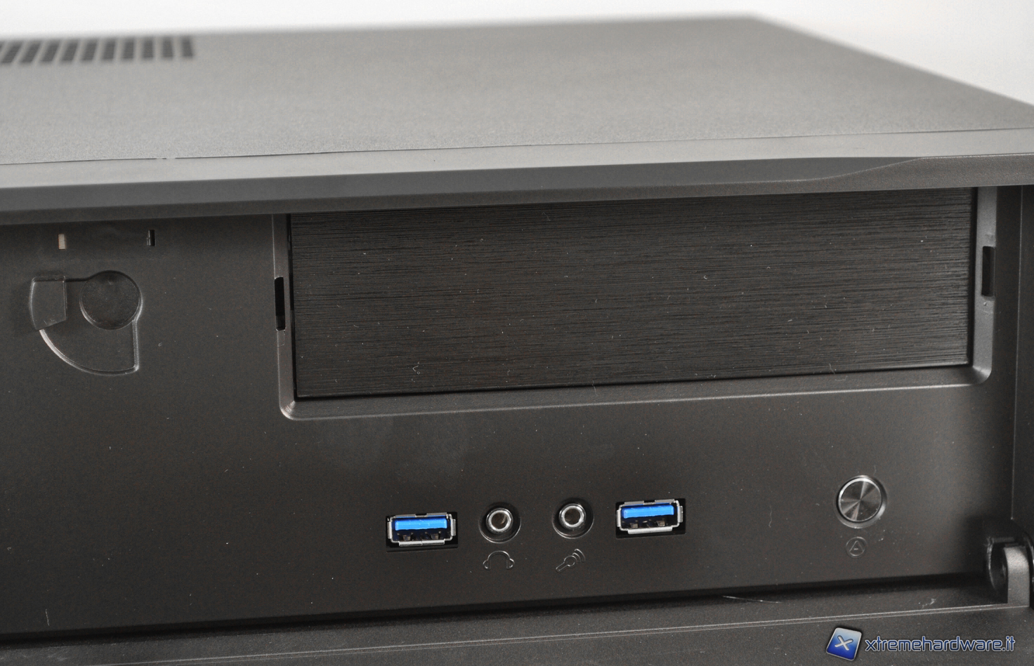 Di seguito troviamo una porta usb 3.0 (riconoscibile dall’interno blu), una connessione per le cuffie / casse, una per il microfono, un’altra porta usb 3.0 e il bottone di reset. Sopra a queste connessioni troviamo un vano da 5.25’’ per l’installazione dei drive ottici.
