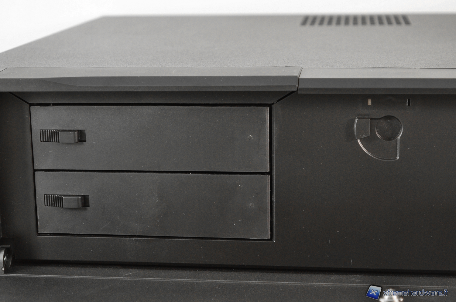 Ecco come si presenta la parte frontale una volta aperto lo sportello. Da sinistra a destra troviamo due vani che ci consentiranno di montare o rimuovere i dischi, anche da sistema avviato, senza che questi si danneggino. Soluzione molto pratica per chi vuole archiviare una mole grande di file su disco fisso. Stiamo parlando del classico Hot Swap, abilitato dalla maggior parte delle schede madri dotate d’interfaccia Sata.