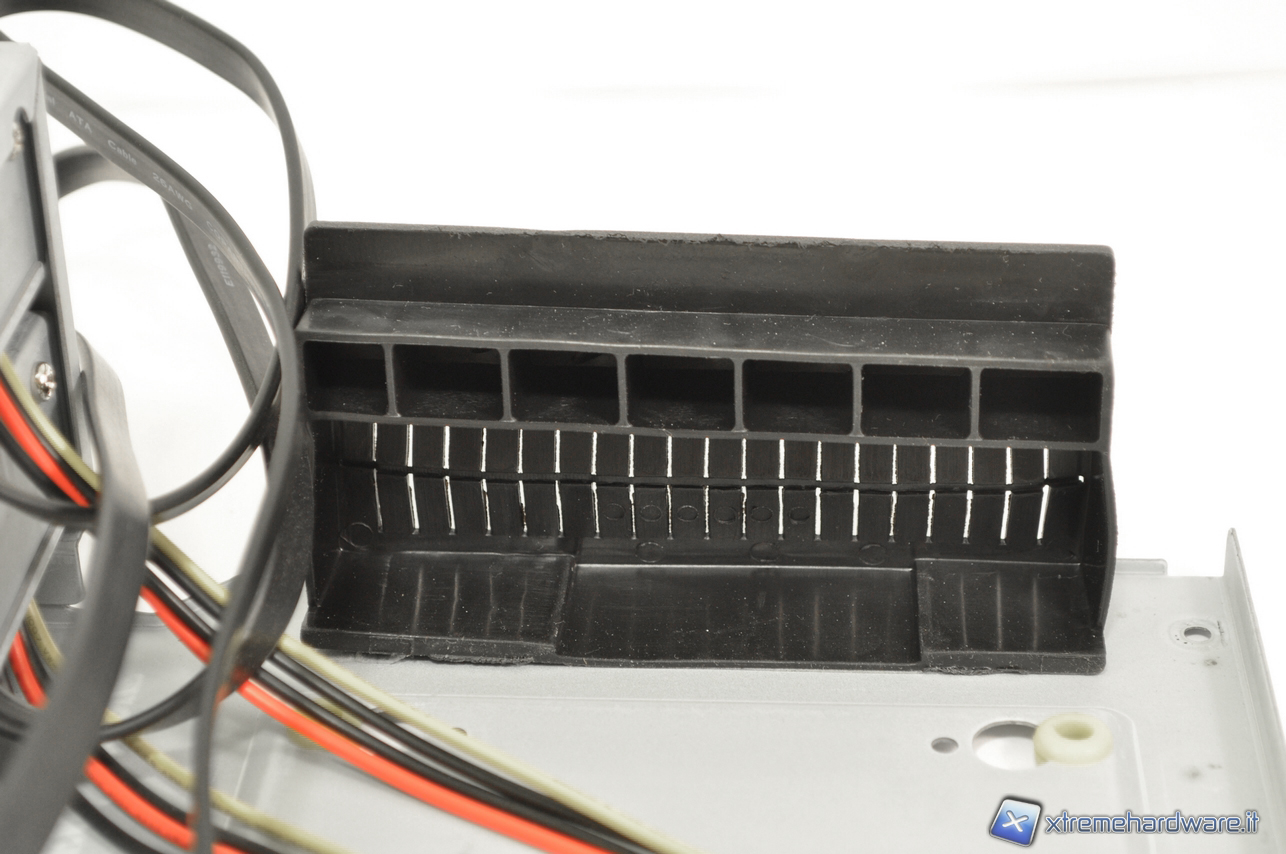 Una volta tolto il coperchio sul tetto ecco come si presenta internamente il nostro case. Possiamo notare principalmente due cose: il vano che ospita il lettore da 5.25’’ e il vano che ospita gli hard-disk hot Swap e tradizionali.  Nelle due immagini di seguito è possibile vedere il cassetto degli hard-disk hot-swap in dettaglio. Si può notare i cavi SATA sul retro da collegare alla scheda madre e i molex a 4 pin.