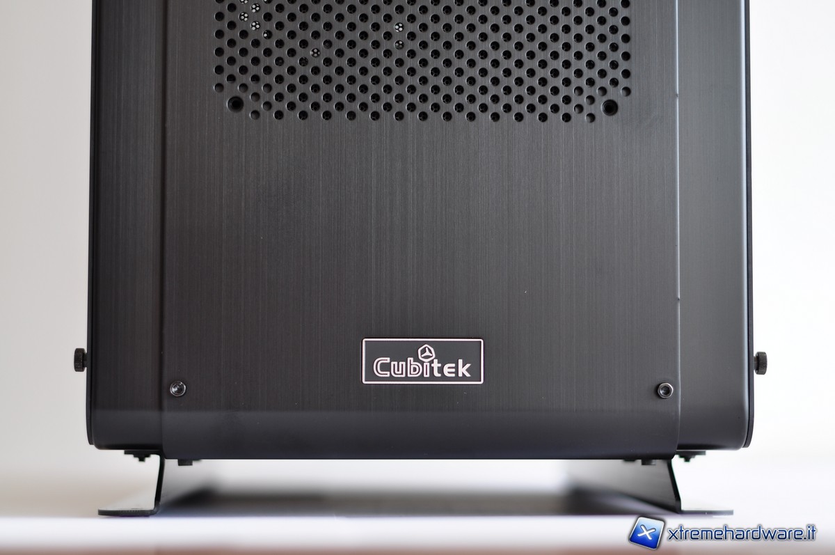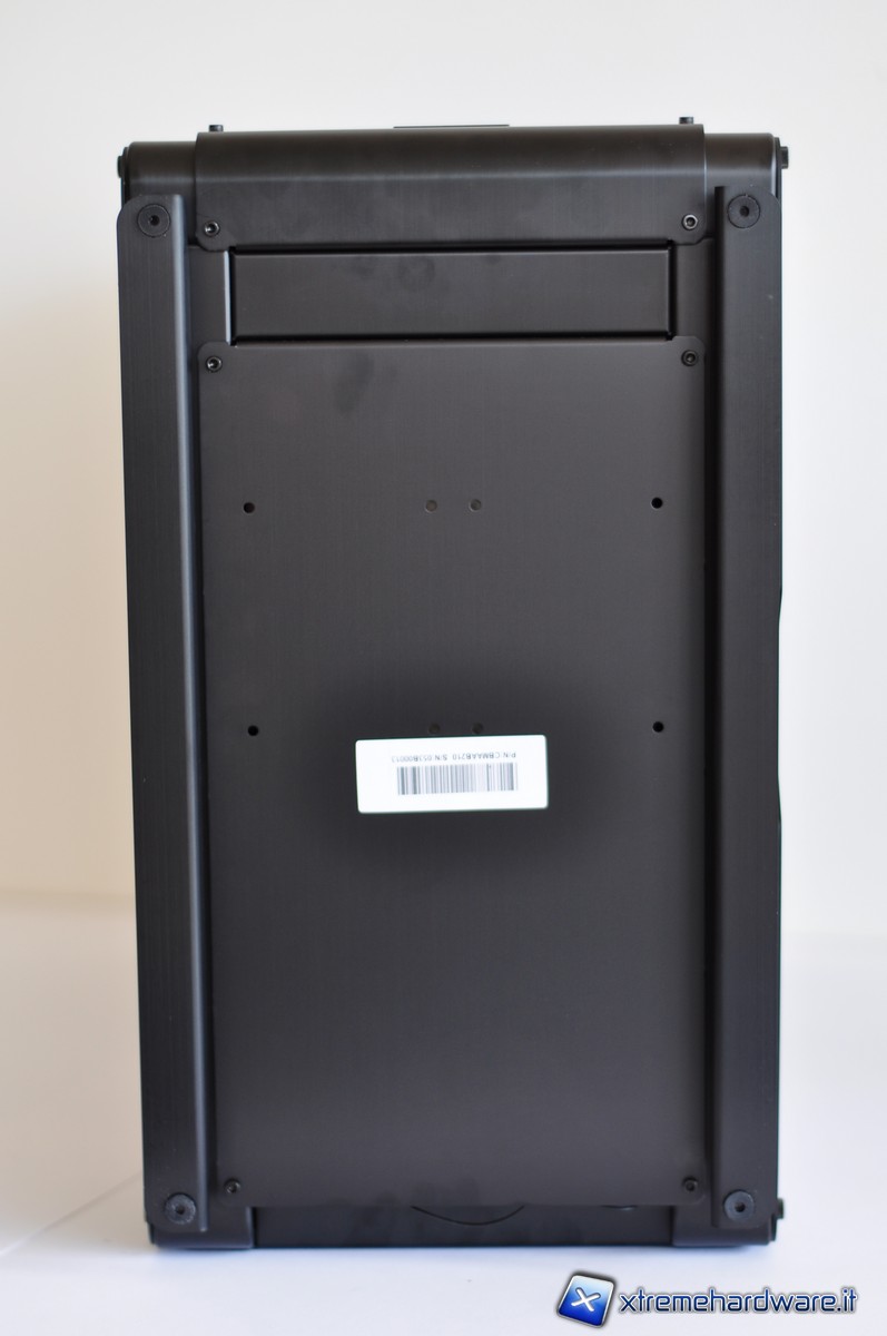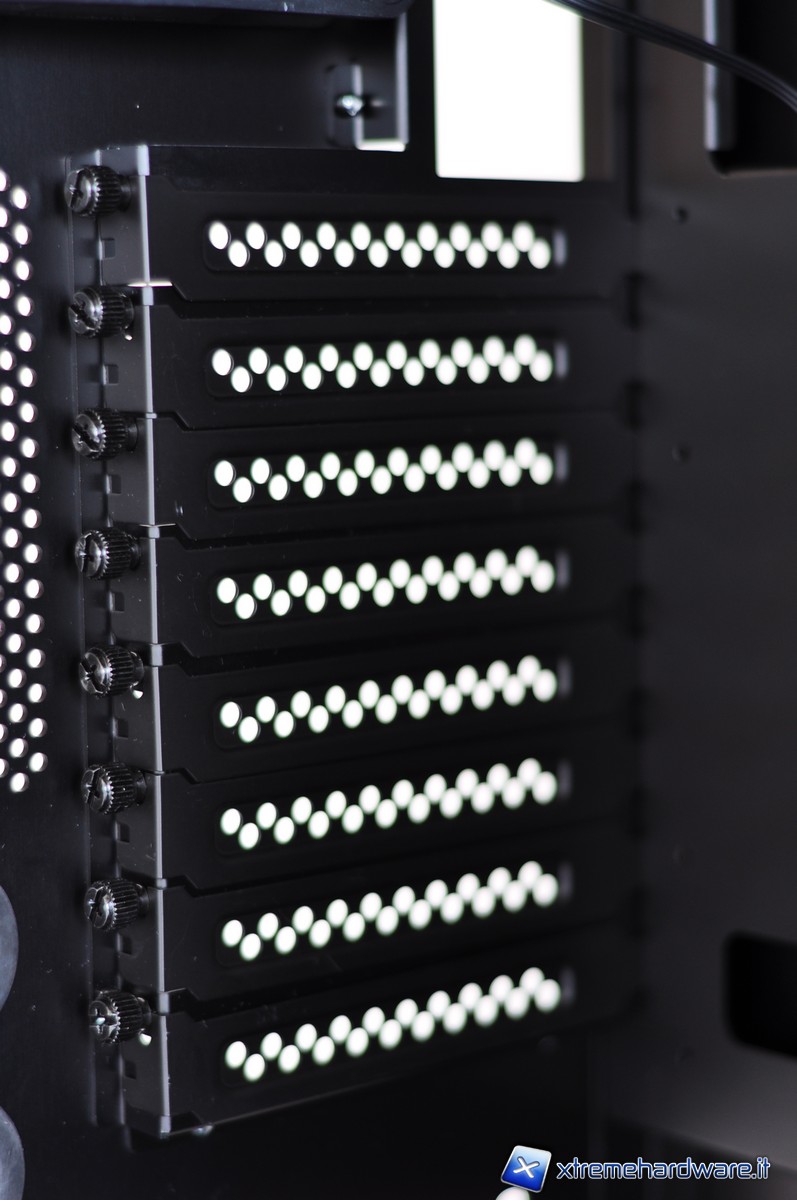 Nella parte posteriore è possibile notare i fori per il passaggio dei tubi dell’impianto a liquido con tanto di guarnizione per evitare che la lamiera possa incidere la gomma. Le piastrine copri-slot PCI sono forate (presentando un grazioso pattern di cerchi) e fissate per mezzo di comode thumbscrew.