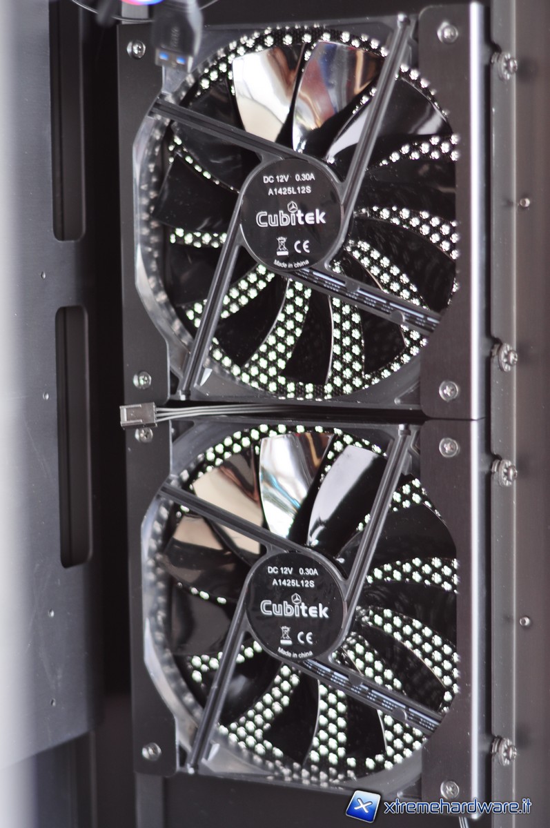 La parte frontale del case presenta una griglia con due ventole da 140 mm in immissione munite di filtri anti-polvere; sembra il posto perfetto per posizionare il radiatore di un impianto a liquido. Nella parte posteriore è presente una ventola da 120 mm in espulsione. Sul tetto invece è possibile montare una ventola da 140 mm (munita anch’essa di filtro anti-polvere) e lo spazio è abbastanza esiguo per posizionare un radiatore monoventola.