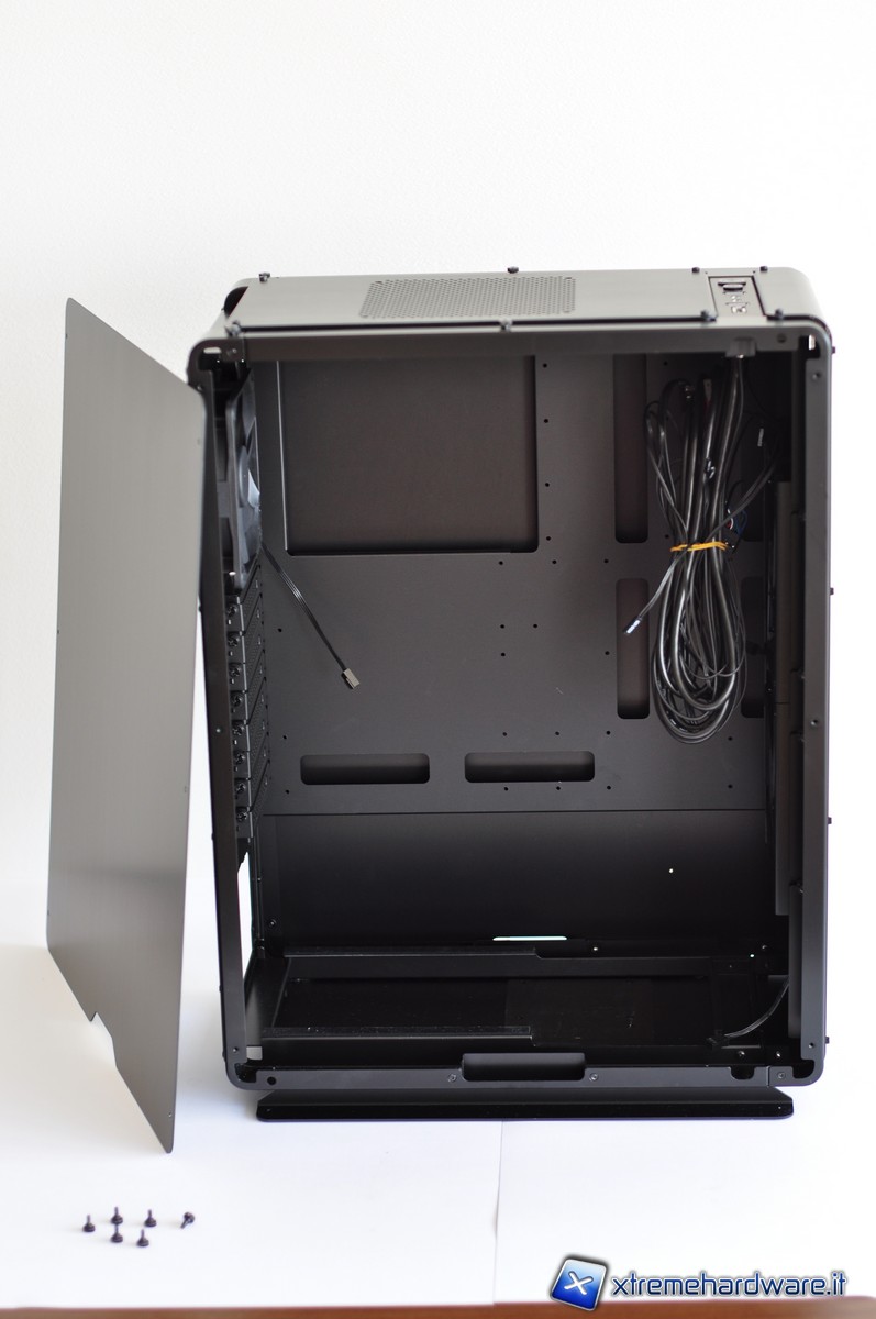 Il tray della scheda madre presenta molteplici feritoie per consentire un efficiente cablaggio, anche se non presentano una cornice di gomma. Senza questa protezione l’alluminio potrebbe danneggiare lievemente il rivestimento dei cavi (cosa evitabile utilizzando delle sleeve). Lo spazio tra la paratia e il tray non è enorme ma sufficiente per consentire una più che dignitosa gestione dei cavi.
