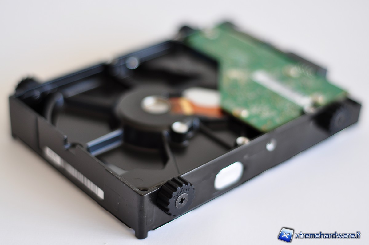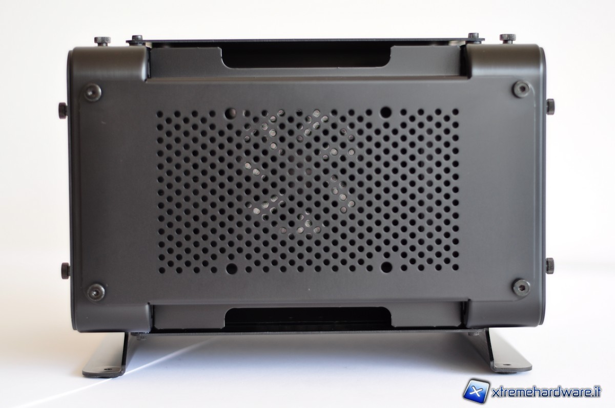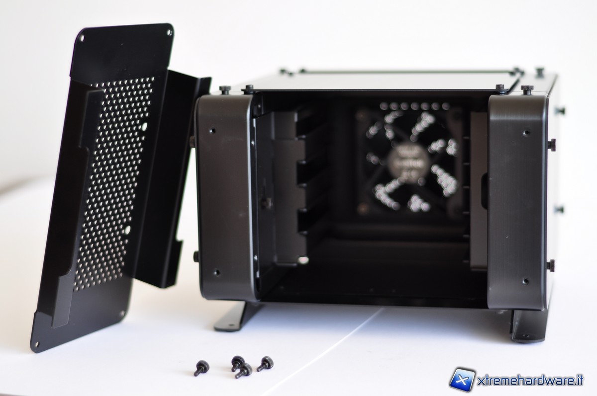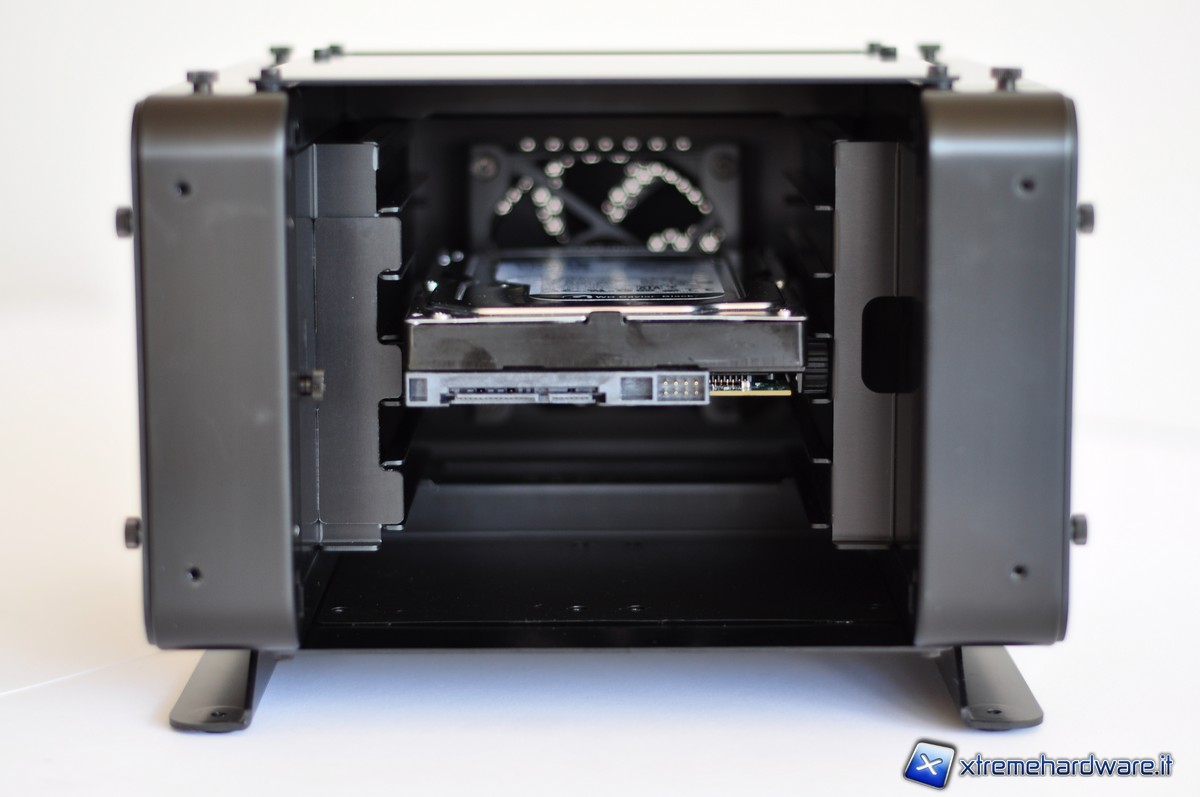 L’interno presenta delle guide per supportare il montaggio di 3 hard disk da 3.5”. Il sistema di montaggio degli hard disk è piuttosto curioso ed pratico. Nel bundle sono presenti 12 gommini a forma di ruota e delle apposite viti con distanziale. Si montano questi gommini per mezzo delle viti sull’hard disk, poi basta far scorrere i gommini sulle rotaie. Basterà poi far scivolare la piastrina basculante allentando l’apposita vite per poi rifissarla in maniera tale da serrare gli hard disk e il gioco è fatto. I gommini garantiscono l’assorbimento delle vibrazioni riducendo il rumore prodotto dal sistema. Sul pannello frontale è presente una ventola da 80 mm con filtro antipolvere dedicata al raffreddamento del modulo. Gli hard disk, grazie alla distanza tra i vari slot, possono davvero trarre giovamento da questo sistema di raffreddamento. Unico neo è che questa ventola dal diametro ridotto risulta un po’ rumorosa.