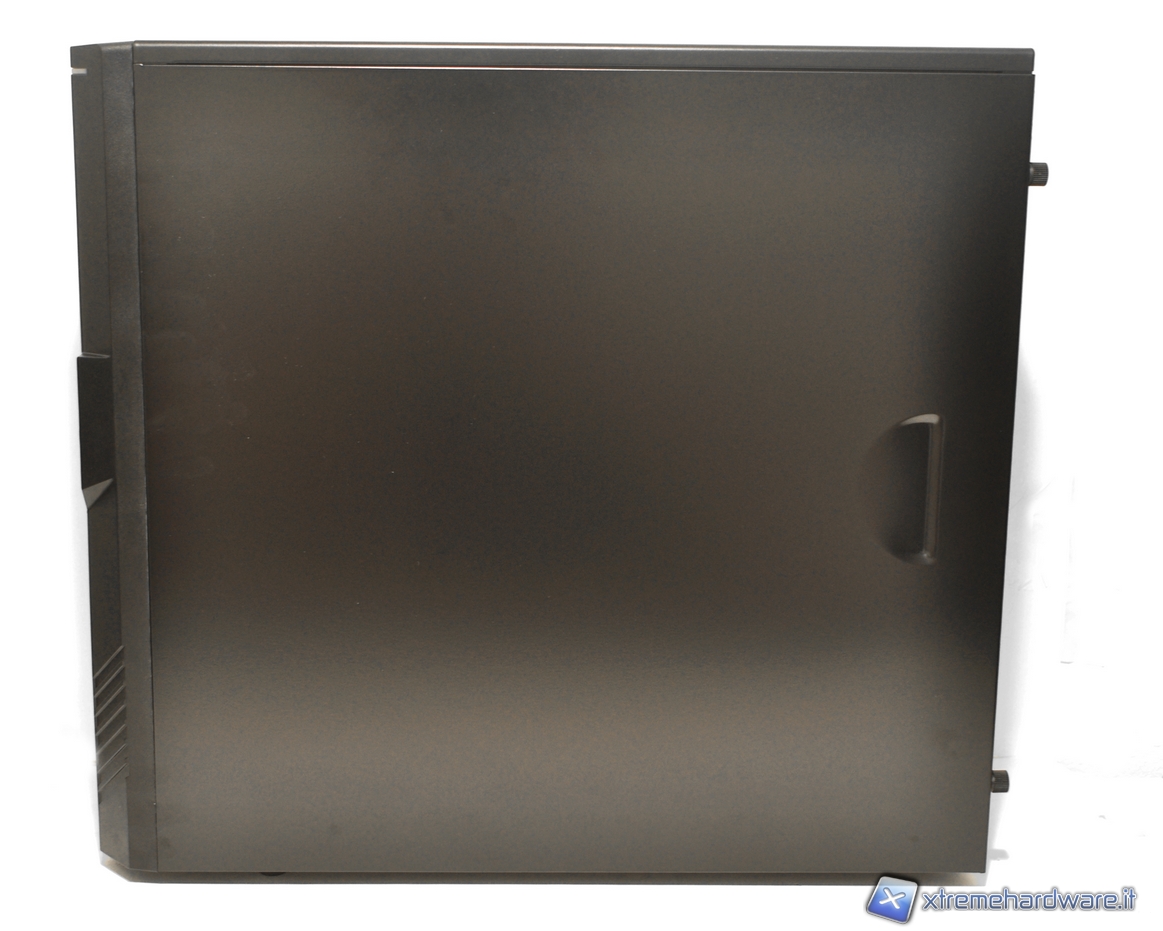 La paratia laterale sinistra del nostro T5 presenta un’apertura rettangolare verso la parte finale della struttura che ci consente di vedere il nostro hardware all’interno, escludendo la visione delle unità ottiche da 5.25’’ e dei drive da 3.5’’, zona solitamente meno curata esteticamente. Nella versione Economy troviamo invece una paratia di colore nero che consente l’installazione di 2 ventole da 120mm.