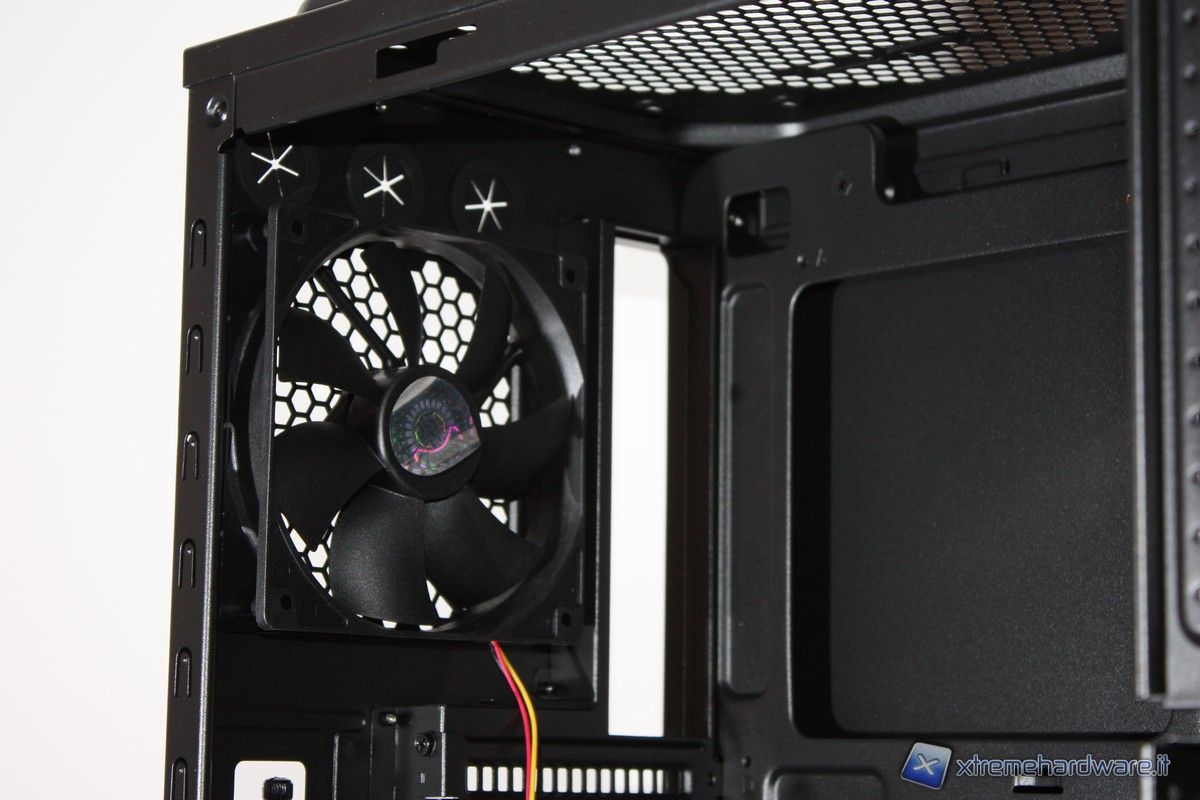 Posteriormente abbiamo infatti la presenza di tre fori, dotati di guaina protettiva, per il passaggio dei cavi di un eventuale impianto a liquido e una ventola (in dotazione) da 120mm in estrazione, molto silenziosa e performante.