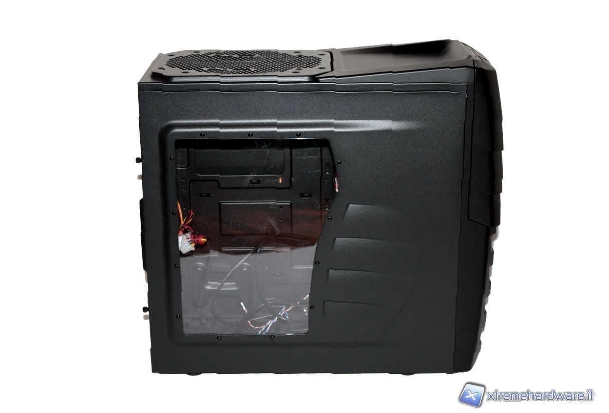 Lateralmente il case presenta una interessante finestra laterale in plexyglass, caratterizzata da un design molto aggressivo e accattivante. Non sono presenti eventuali griglie per il fissaggio di ventole laterali. L'altro versante del case invece è completamente chiuso ma rimuovibile lo stesso.