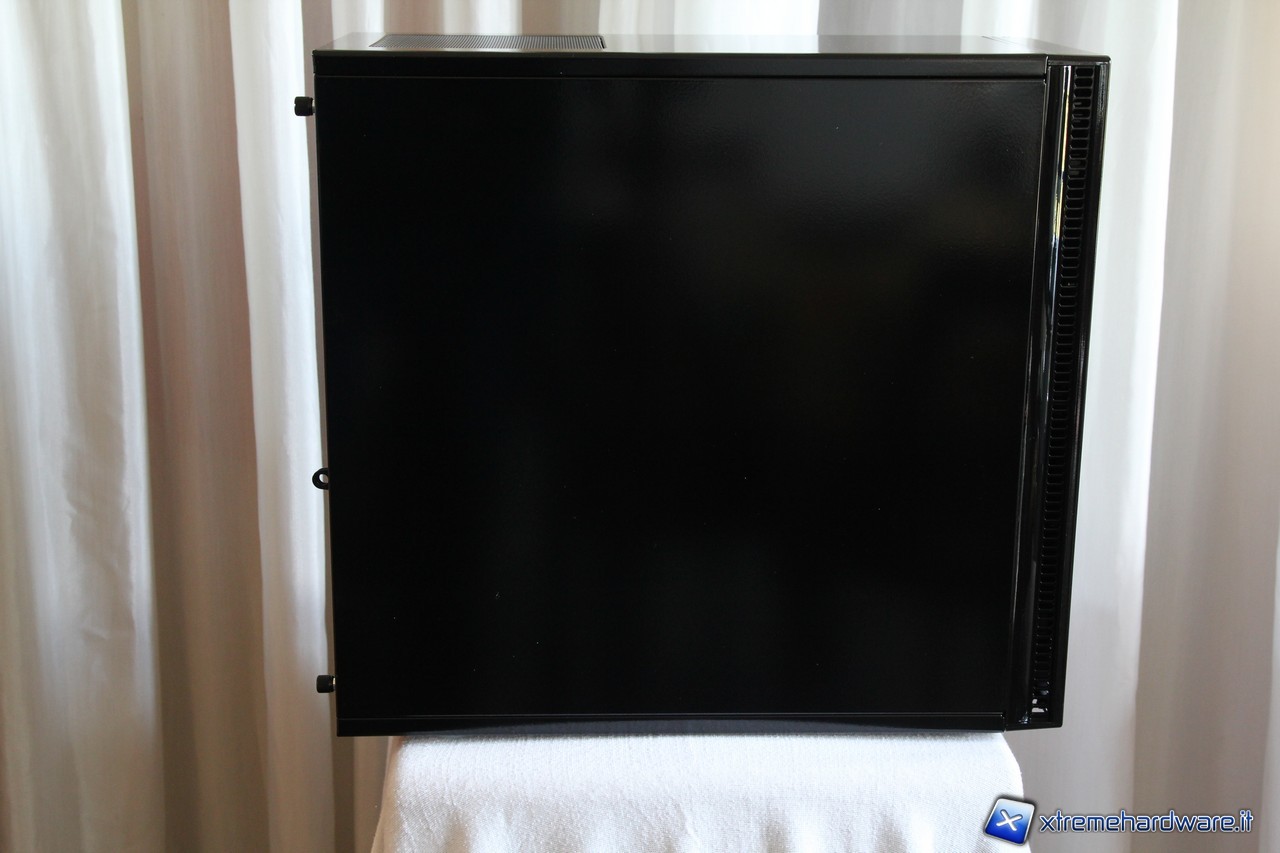 I pannelli laterali non presentano finestre o griglie di aereazione, la loro verniciatura è perfetta e priva di imperfezioni. Particolare attenzione va al pannello sinistro che utilizza delle viti a pressione che rimangono attaccate al pannello stesso una volta rimosso. Esso incorpora inoltre un sistema di sicurezza composto da due anelli nel quale potremmo apporre un lucchetto per impedire l’accesso al nostro hardware interno.