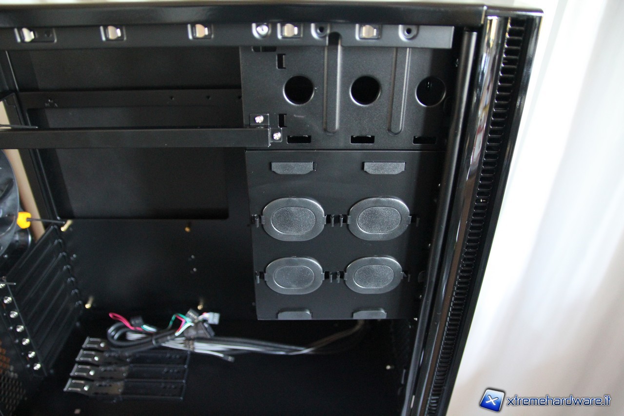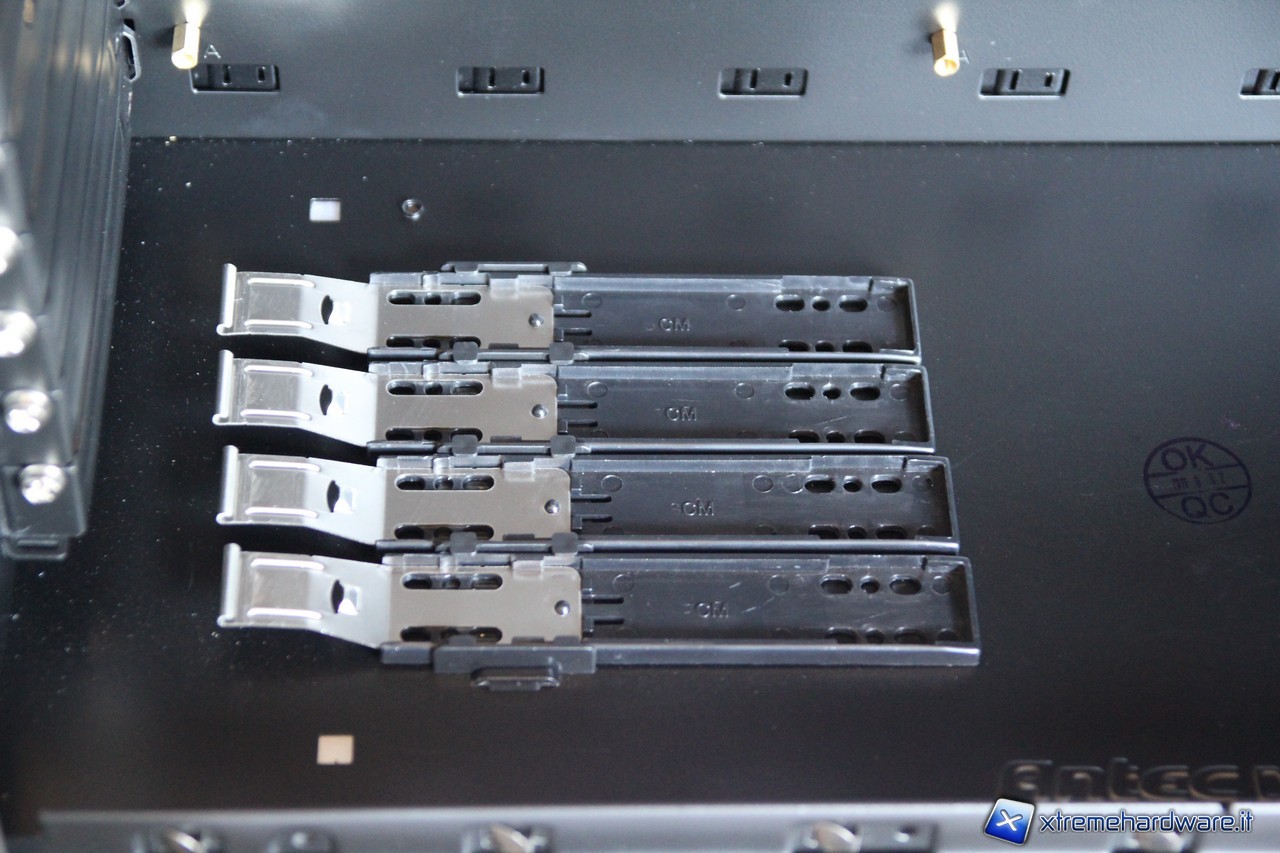 Si notano anche i due vani per il fissaggio di due periferiche da 5.25 pollici mediante le slitte forniteci nel bundle ed il cestello per gli hard disk, dove ricordiamo di poter istallare le periferiche con il classico sistema a  "bracket" oppure in sospensione tramite il sistema proprietario Antec.
