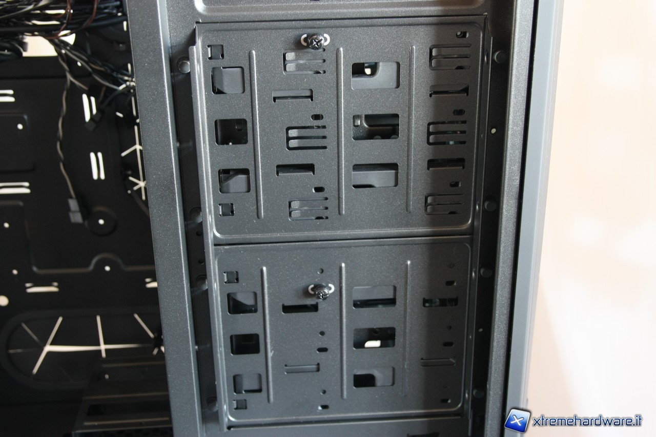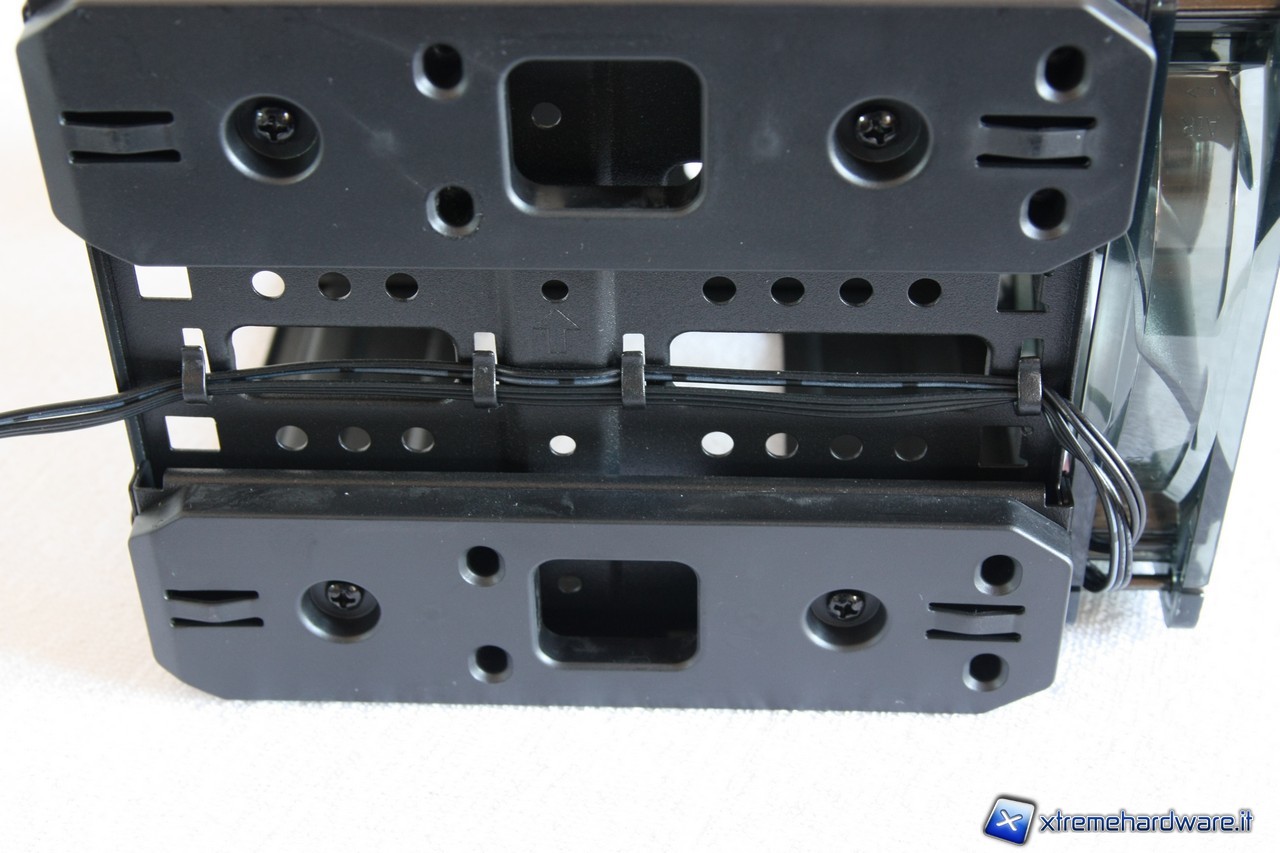 A questo punto potremo rimuovere i due cestelli per gli hard disk, segnaliamo anche qui l'estrema cura dei particolari, i fili delle ventole sono infatti fissate alla struttura del cage.