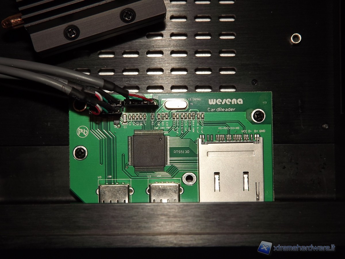 Dal PCB presente dietro l'interrutore Power è presente un cavo che andrà collegato sulla scheda madre nei pin relativi al Power e al Power Led. Nell'altro PCB sempre prodotto da Wesena abbiamo un chip Realtek RTS 5130. Quest'ultimo è un controller avanzato che racchiude numerose funzioni in unico chip: USB 2.0 Transceiver, MCU, SIE, regolatore di accesso alla memory card. Il RTS5130 può supportare i formati CompactFlash, Micro Drive, Smart Media Card, Memory Stick, Memory Stick Pro, Secure Digital, Multi-Media Card e xD-Picture Card TM.