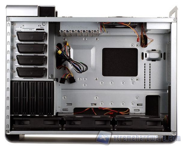 Non è presente la ventilazione frontale per come siamo abituati a concepirla, similmente al TJ04-Evolution, ma data la presenza di ben tre ventole da 180mm inferiori e dato il posizionamento ruotato della scheda madre, non ce ne sarà bisogno. I dischi rigidi possono essere raffreddati dalla prima ventola AP181, che oltre ad essere settata in immissione, permette di aumentare l’aerazione anche nel comparto frontale del cabinet, evitando ristagni di aria calda.