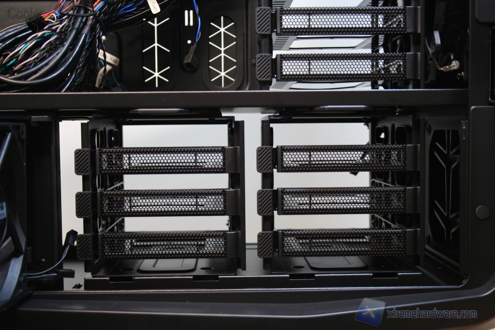 Il layout, sebbene presenti alcune ricercatezze, è simile allo standard in quanto l’orientamento della scheda madre è classico ATX, il posizionamento dei bay per gli hard disk è nella parte frontale, identico quello delle periferiche da 5.25” ed è anche identico quello dell’alimentatore inferiore, sebbene però sia presente la separazione in due scompartimenti, tesa ad isolarli a livello termico. Si è scelto di procedere in questo modo anche per via della presenza di ulteriori 6 bay per hard disk nella parte inferiore e frontale, che però vengono raffreddati da un pratico ed efficiente sistema dedicato di ventilazione comprendente due ventole da 120mm, che pescano aria da fessure dedicate nella paratia laterale.
