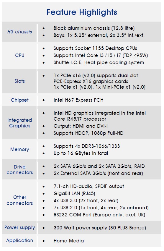 Nonostante le dimensioni estremamente compatte, il modello SH67H3 offre molto spazio al suo interno, è possibile ad esempio alloggiare un'ulteriore scheda grafica PCI-Express di tipo discreto; la scheda madre è dotata di ben quattro slot di memoria di tipo DDR3, uscite video HDMI / DVI-I, interfaccia di connessione unità di archiviazione SATA 6Gb/s, porte USB 3.0, Gigabit LAN, audio a ben  8 canali surround con uscita S / PDIF e External Serial-ATA. Nell'SH67H3 è inoltre possibile inserire un'unità esterna da 5.25" ed altre due unità esterne/interne da 3.5".