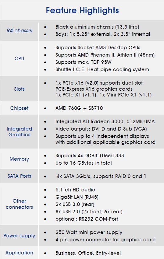 Lo Shuttle XPC Barebone SA76R4 è costituito da un elegante cabinet con preinstallata la scheda madre prodotta direttamente da Shuttle (con supporto per CPU AM3 da TDP massimo di 95W Athlon II/ Phenom II/ Thuban), un alimentatore (PSU) con cavi già disposti ed un sistema di raffreddamento ad alta efficienza. Nonostante il suo form factor di ridotte dimensioni il prodotto di Shuttle offre una straordinaria connettività, funzionalità ed alte prestazioni. Per rendere completo il sistema PC è necessario acquistare separatamente: processore, memoria di sistema, unità di archiviazione quali hard disk oppure unità allo stato solido, unità ottiche e sistema operativo. In questo modo l'utente può personalizzare il proprio Barebone secondo le proprie esigenze individuali.