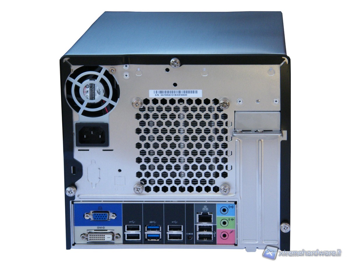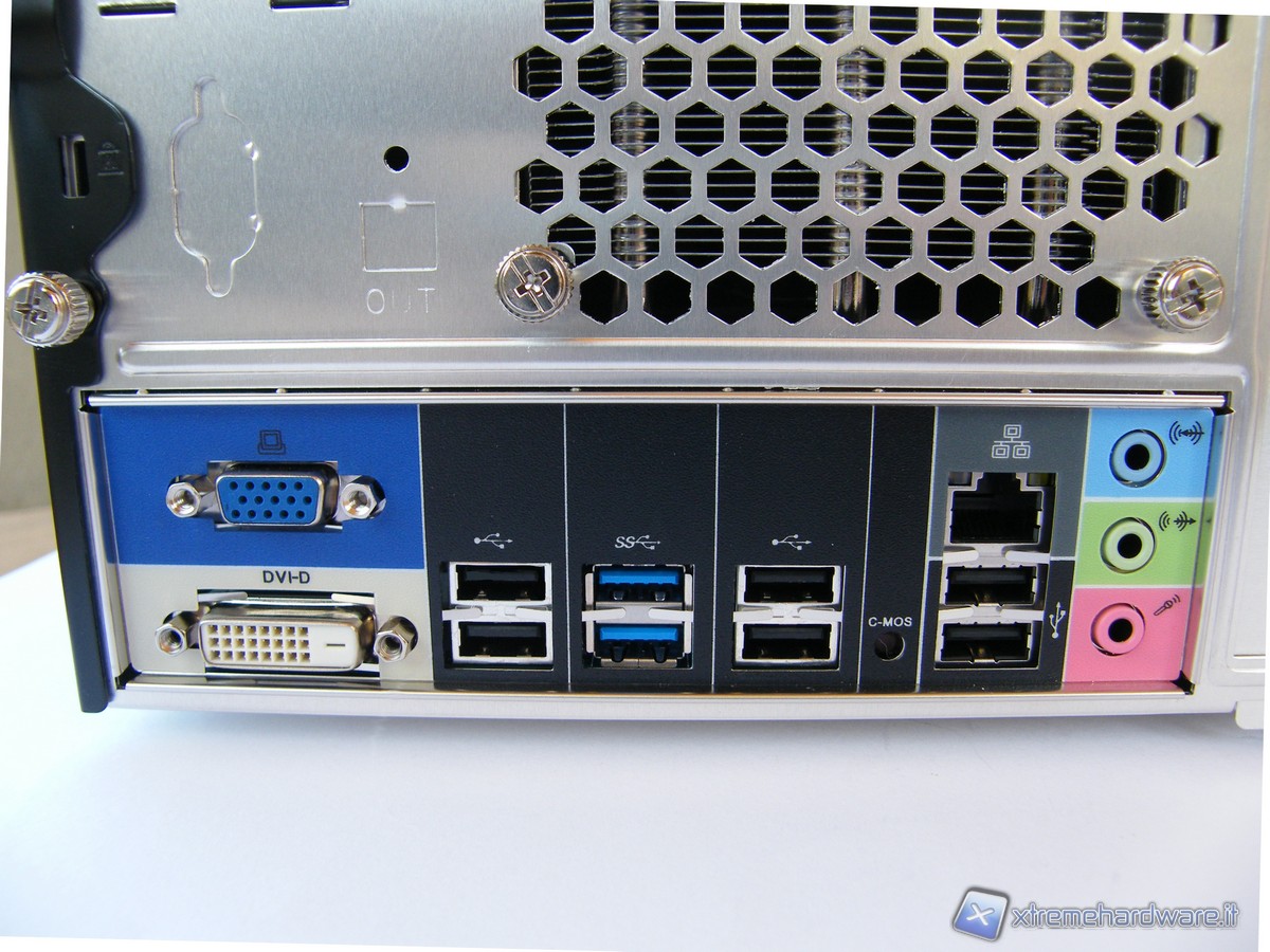 Analizzando la parte posteriore del PC, la mascherina della scheda madre si presenta con diverse connessioni ed uscite video. In particolare abbiamo un uscita D-Sub VGA ed una DVI-D, 6 porte USB 2.0, 2 porte USB 3.0, una porta GigaBit LAN (RJ45), le uscite analogiche con connettori da 3,5 mm per i 6 canali audio: Front Line out (cuffie), Rear Surround line-out, Center line-out line-out . E' possibile inserire una porta seriale (RS-232) opzionale. Infine è possibile avere accesso al pulsante Clear CMOS.