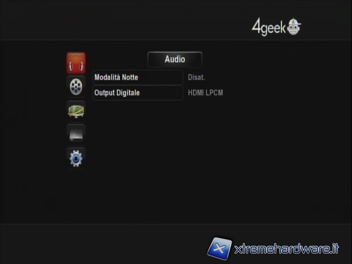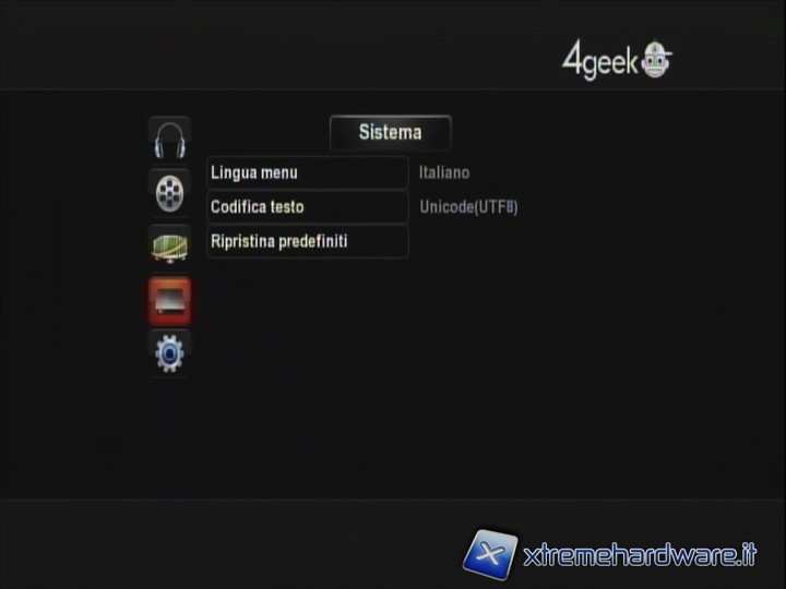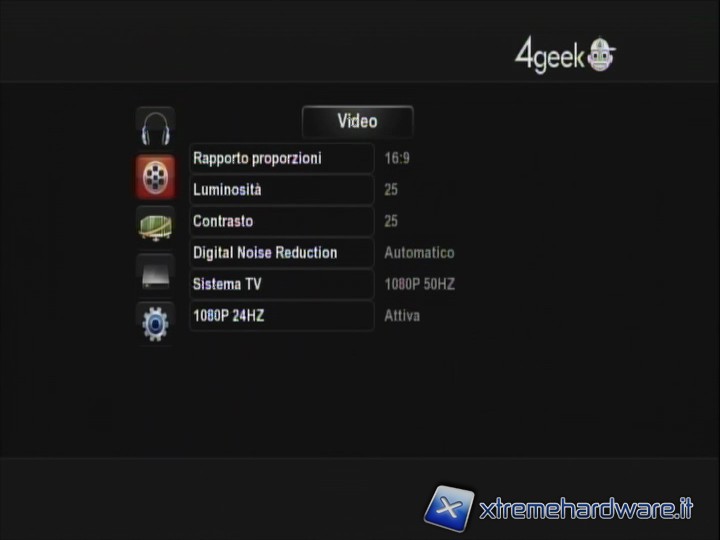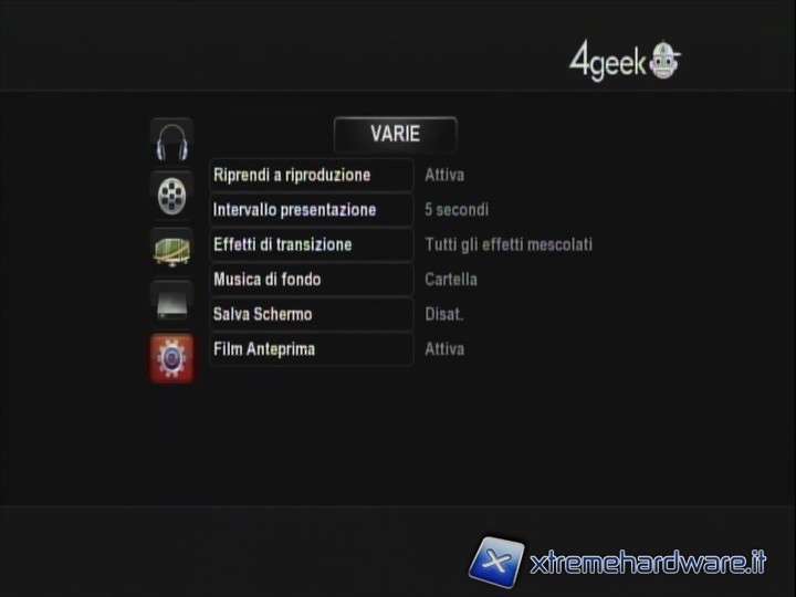 IMPOSTAZIONI: come è facilmente intuibile qui si possono impostare tutte le configurazioni di audio, video, rete, sistema, varie (in quest’ultimo menù si impostano ad esempio la presentazione delle immagini, la musica di sottofondo, o l'anteprima quando si va a sfogliare la libreria film remota). Non è presente una voce 'update', il che non vuol indicare una volontà di 4Geek di lasciare gli utenti a se stessi, ma una semplice opzione inutile per un prodotto che è uscito perfettamente funzionante e senza punti deboli.