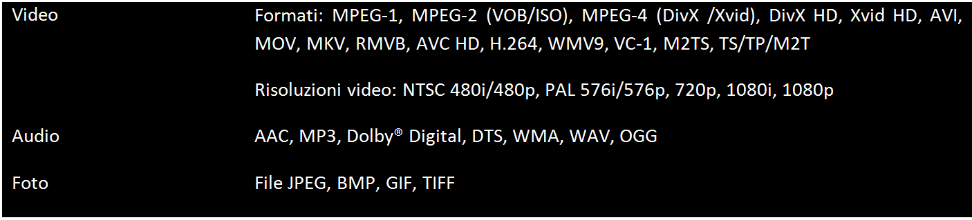 Riproduce praticamente qualsiasi formato video che potete avere sul vostro pc. Basta avviare la condivisione di Windows Media Player sul pc o installare un qualsiasi server multimiediale di terze parti (Ps3MediaServer, Mediatomb, Twonkymedia), e sedersi comodamente sul divano per godersi QUALSIASI contenuto condiviso sul pc.