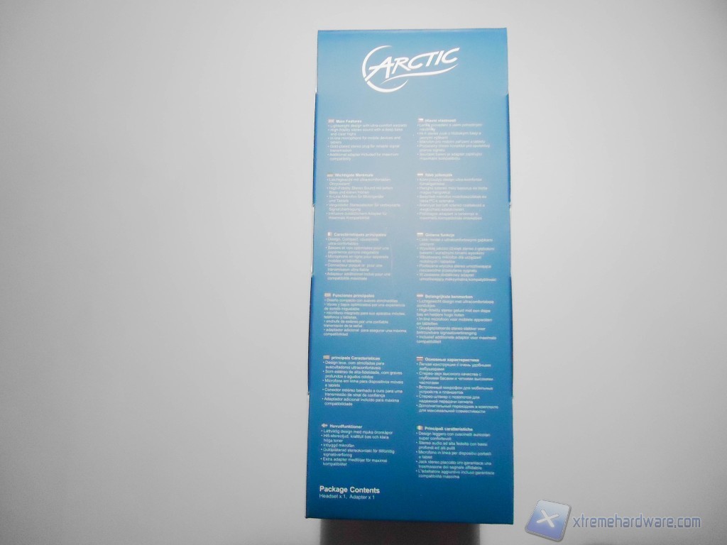 Togliendo questo involucro esterno in plastica trasparente troviamo la confezione in cartone caratterizzata dai colori blu e bianco. Nella parte frontale troviamo la rappresentazione delle cuffie con la nomenclatura del modello specifico e inoltre sono riportate le compatibilità con tablets, smartphones e PC portatili. Infine in alto a destra è riportato anche l’indirizzo web di Artic.