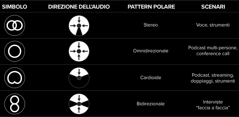 Dalla regolazione del Gain passiamo invece a quella del pattern. L’HyperX QuadCast mette a disposizione nel lato posteriore una piccola manopola che ci permetterà di scegliere tra 4 pattern in totale. Abbiamo a disposizione i più comuni che sono, in ordine da sinistra a destra, riportiamo la tabella per velocizzare e comprendere al meglio.