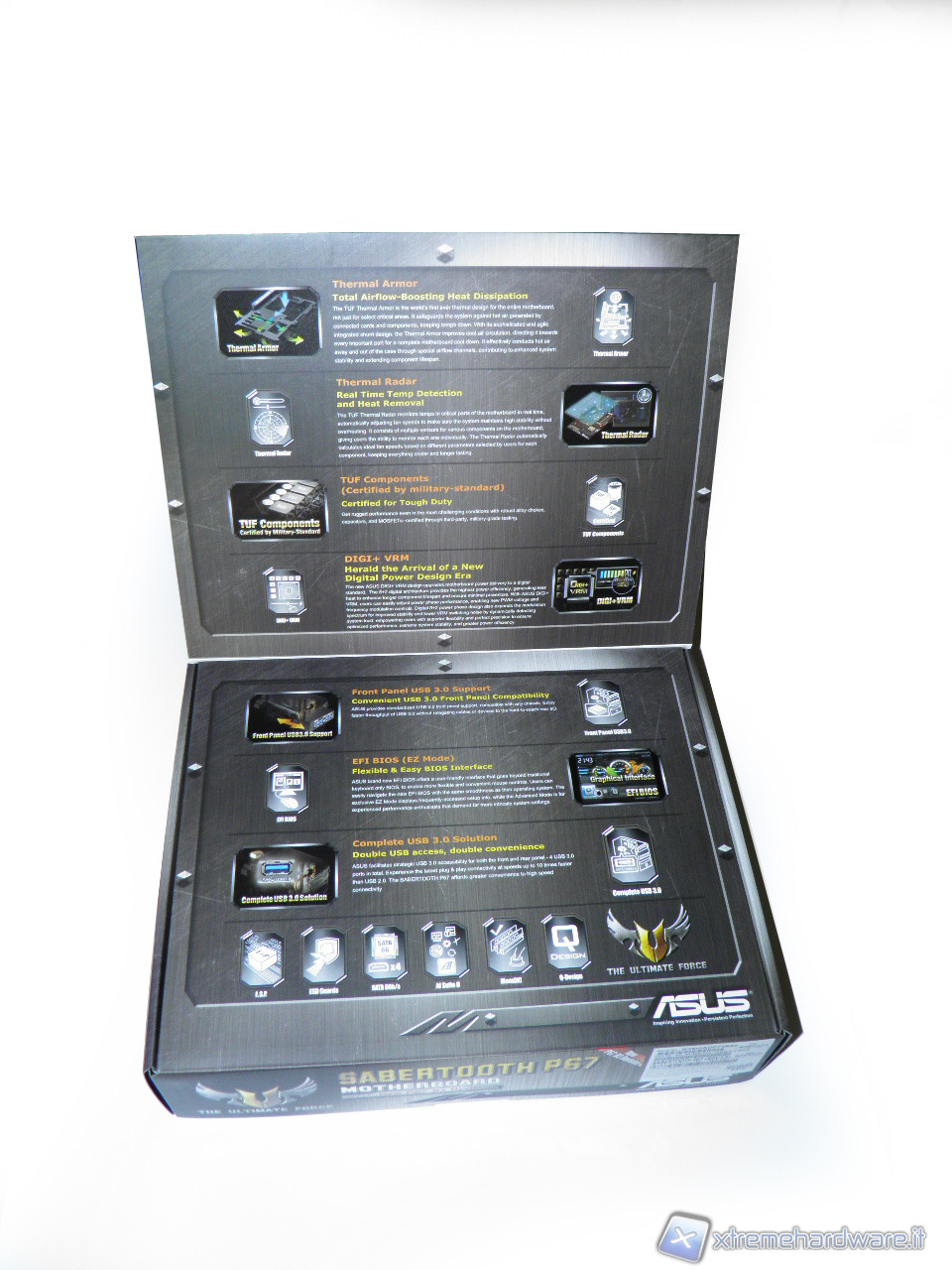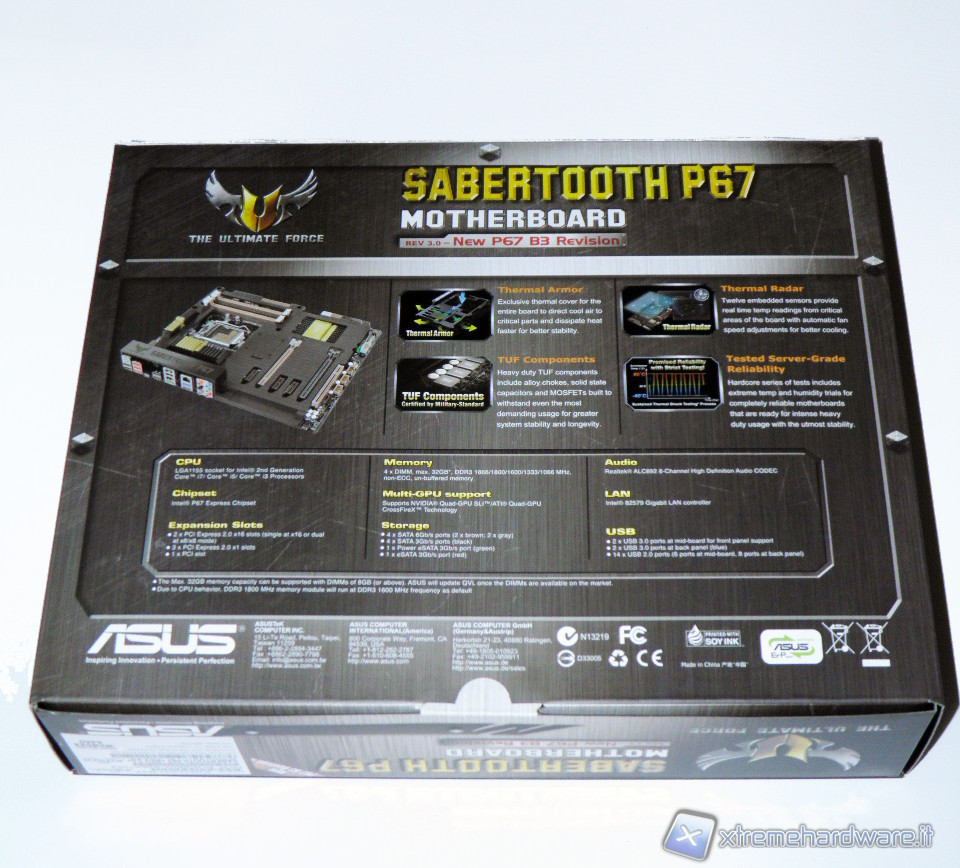 Presa in mano la scatola del prodotto, si sente subito un discreto peso, segno dell'alta qualità della scheda. Sul fronte della confezione spicca subito in alto il logo TUF, sul retro sono invece riportate le caratteristiche tecniche della scheda. La scatola, inoltre, presenta un'apertura della parte frontale come un libro, che riprende le features importanti della scheda descrivendole. Non è visibile direttamente l'hardware come in altre scatole di schede madri di fascia alta.